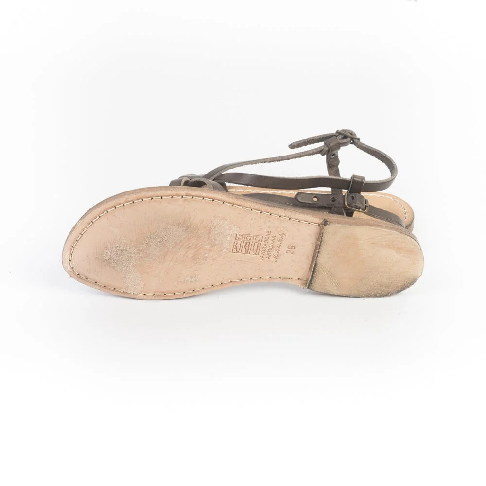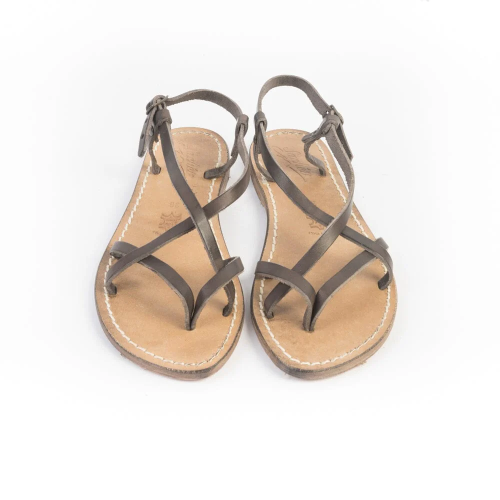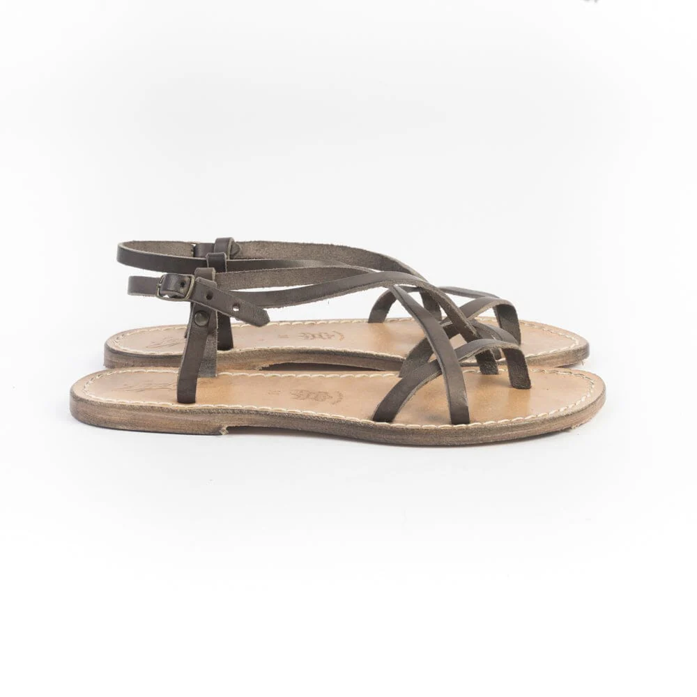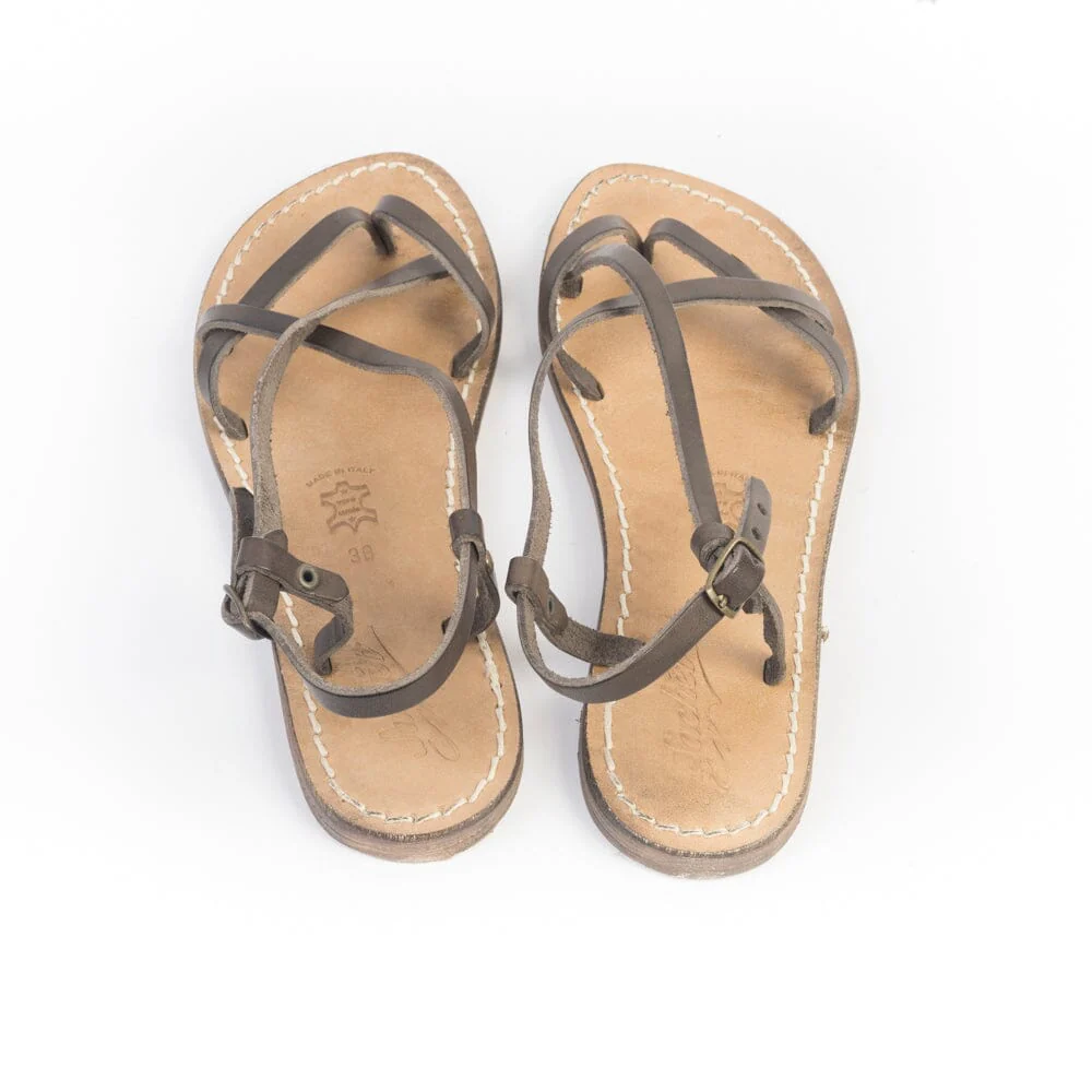 Sandalo infradito realizzato per Sachet, realizzato in pelle di vitello di colore testa di moro con fasce incrociate su tomaia, chiusura con cinturino sottile regolabile alla caviglia. Suola e profili in cuoio fresati ed anticati per un effetto vintage. Lavorazione artigianale fiorentina Realizzato in Italia. Calzata regolare Guida taglie> Per maggiori informazioni sulla calzata contattaci>