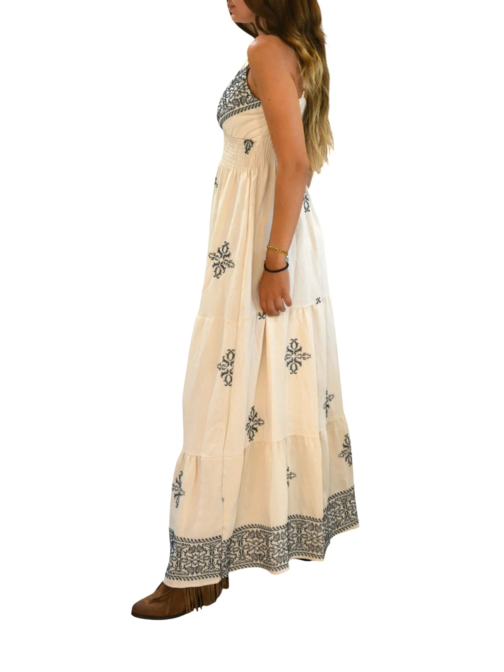 Questo abito lungo in viscosa arricchito da delicati ricami blu che ne esaltano la raffinatezza. Le spalline regolabili garantiscono una vestibilità personalizzata, adattandosi perfettamente a ogni silhouette. Capace di valorizzare ogni occasione con stile sobrio e ricercato.