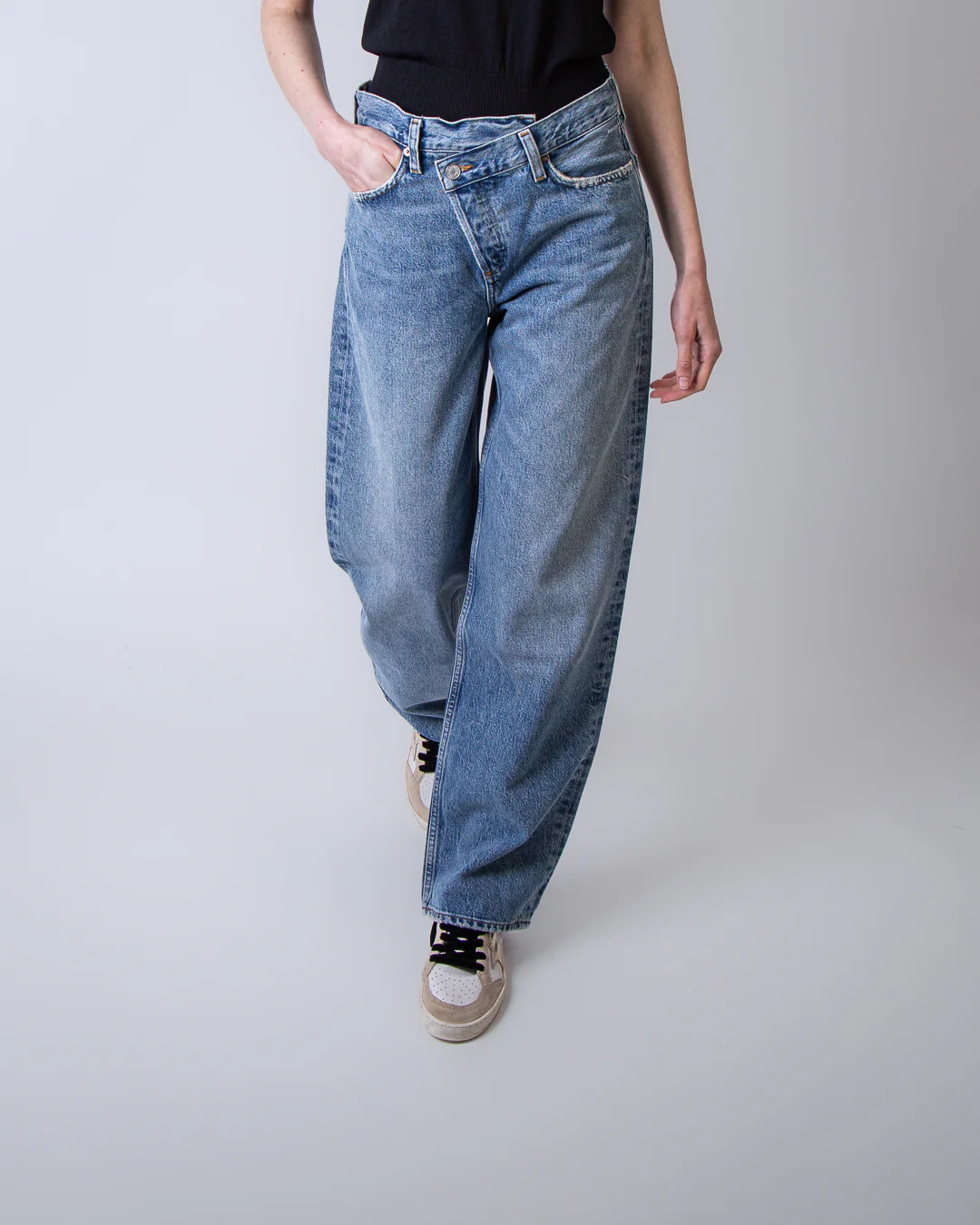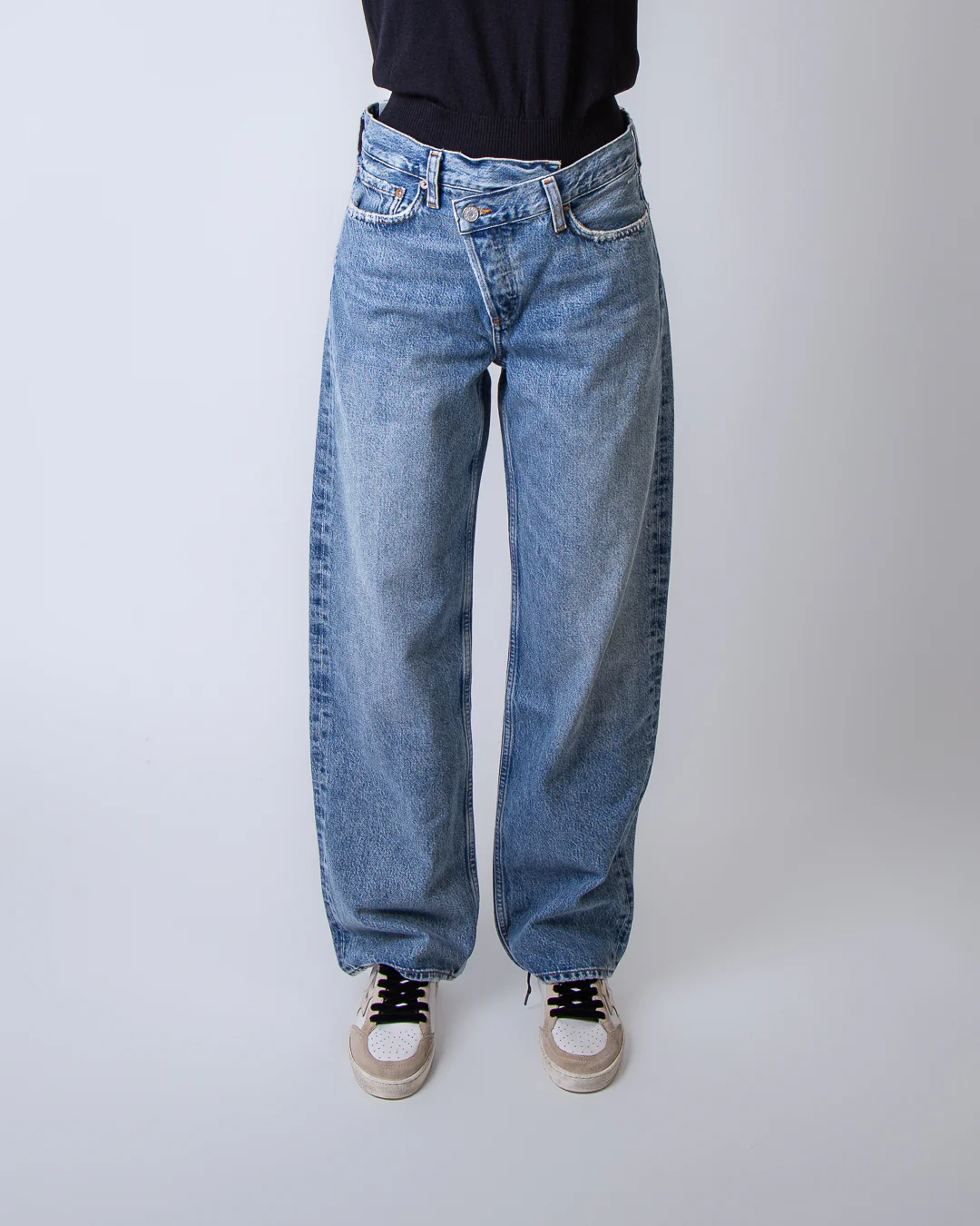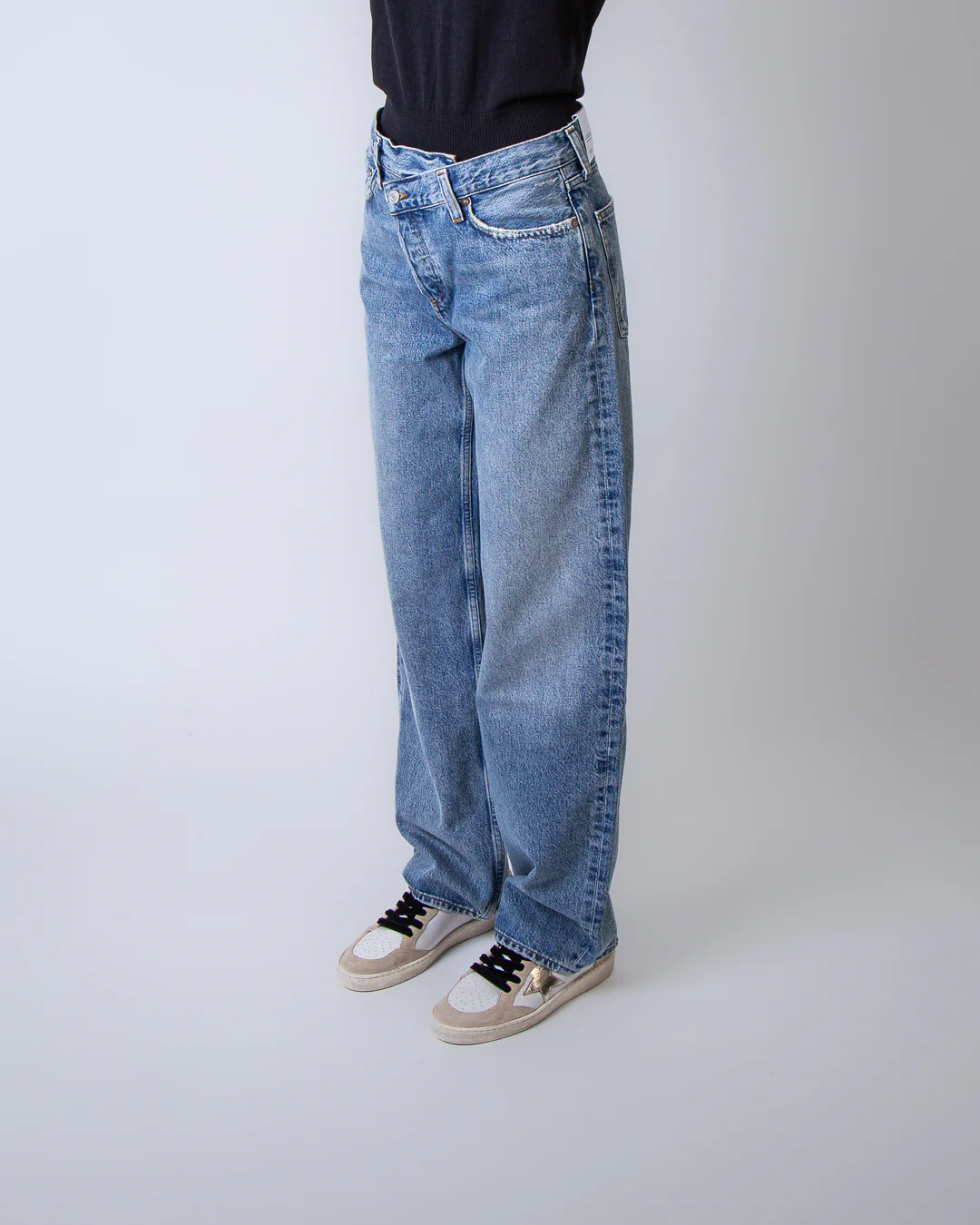 Agolde, jeans donna A317-1885 CNCL blu, modello conclusion. La modella รจ alta 175cm e indossa la taglia 26