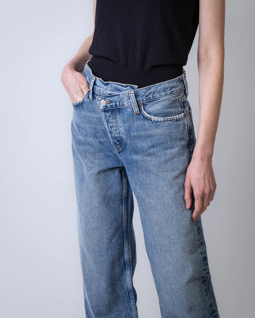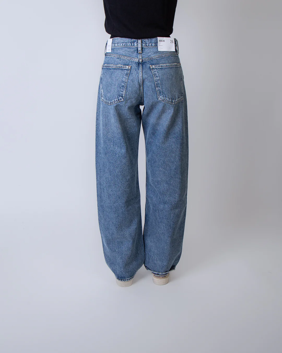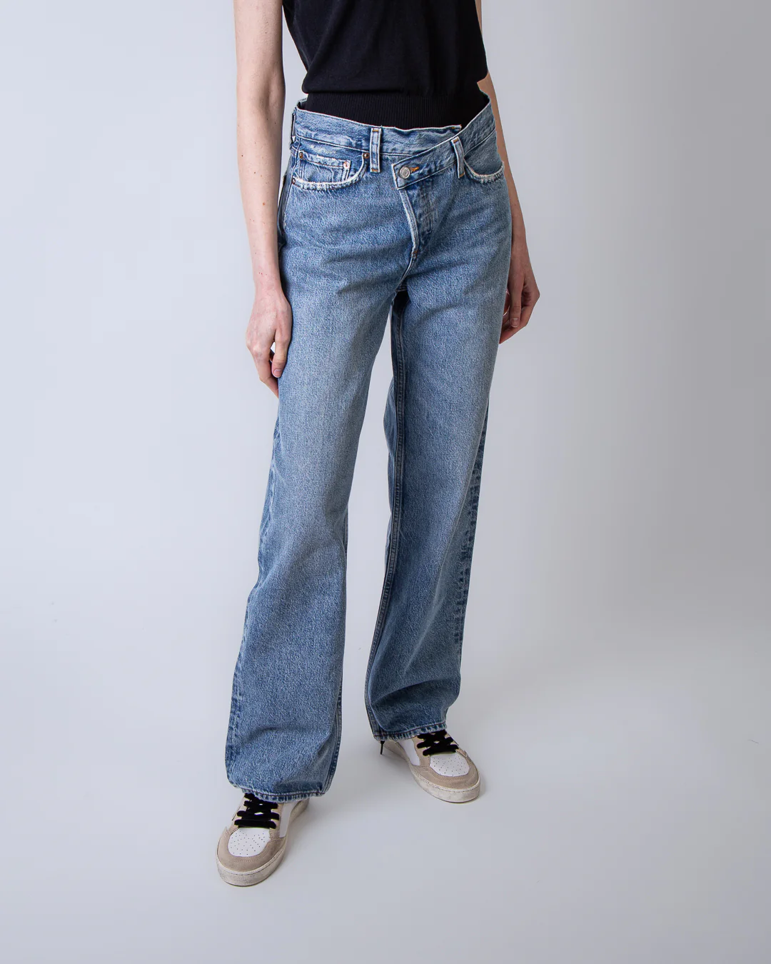 Agolde, jeans donna A317-1885 CNCL blu, modello conclusion. La modella รจ alta 175cm e indossa la taglia 26