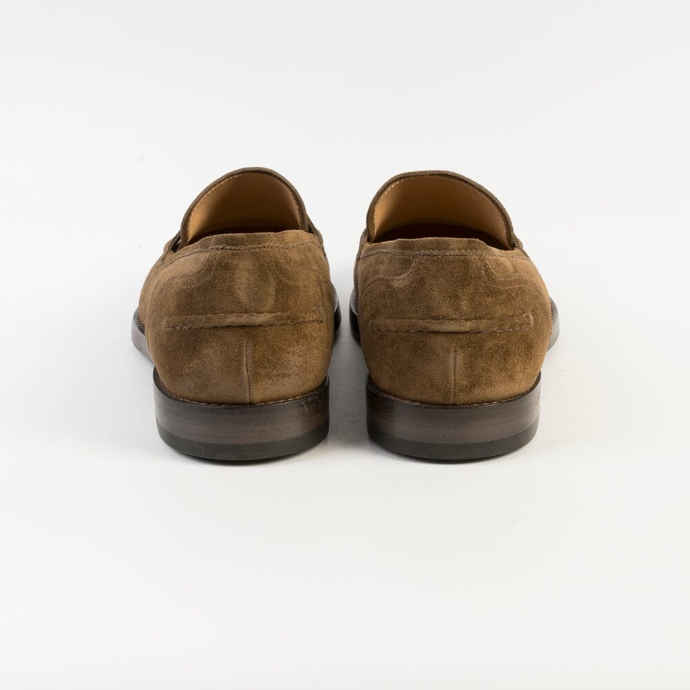 Classico Mocassino college di Alberto Fasciani realizzato artigianalmente in morbida pelle scamosciata di colore nocciola. Punta affusolata con cucitura e mascherina, interno foderato in leggerissima pelle, con particolare del marchio impresso a fuoco su soletta interna. Soletta in pelle e fondo cuoio con inserti in gomma tacco 3 centimetri.