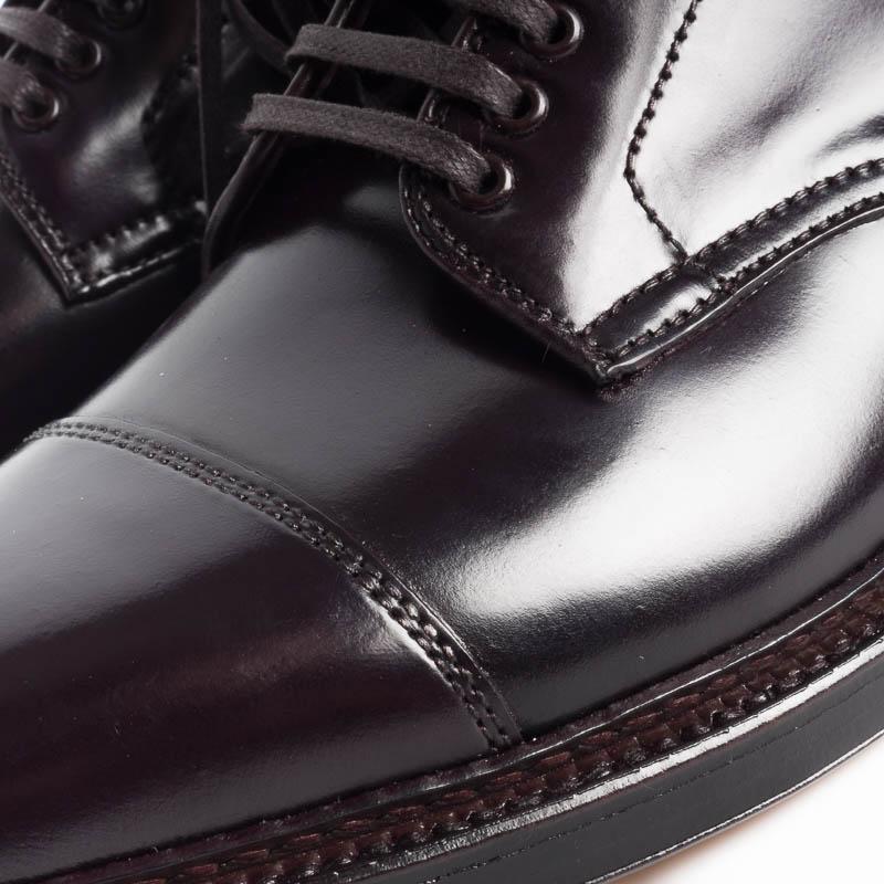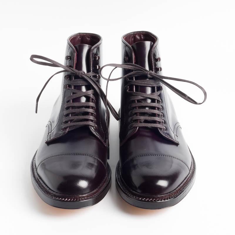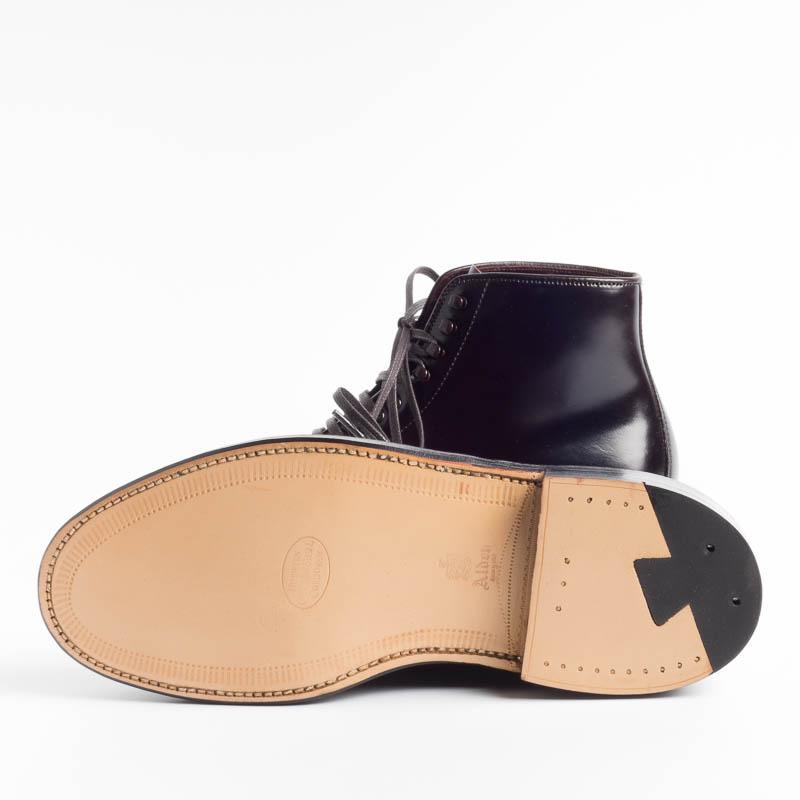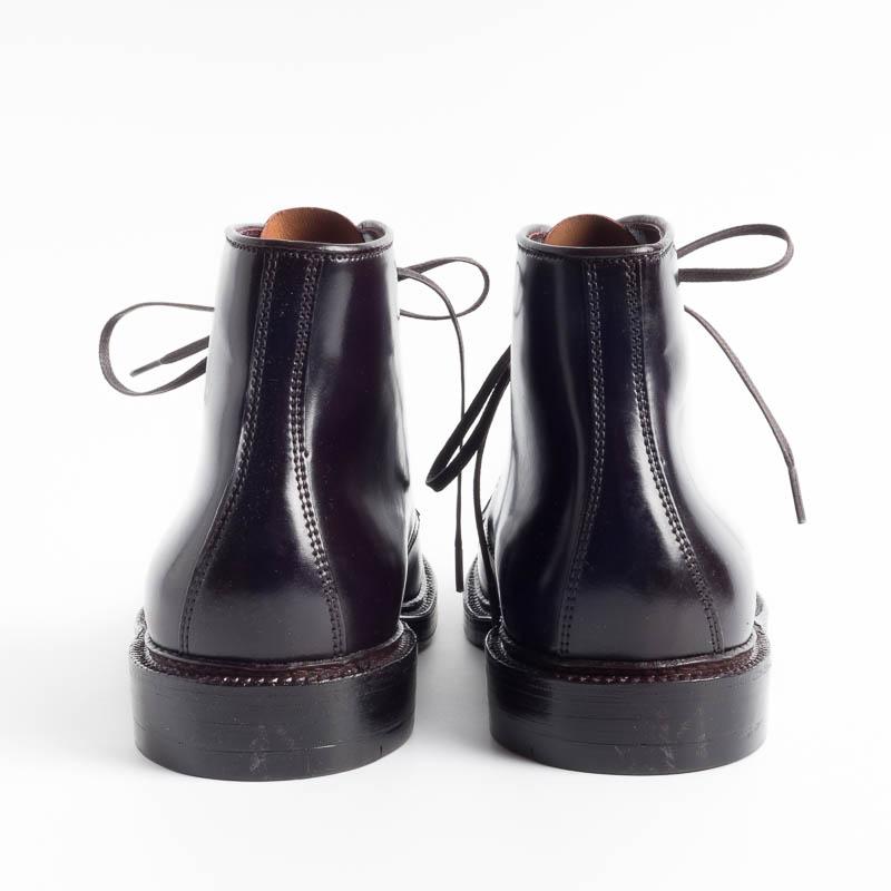 Polacco di Alden cinque fori piรน quattro ganci, realizato in culatta di Cavallo di Horween, colore bordeaux con puntale liscio. Lavorazione goodyear, triplo fondo in cuoio, guardolo con cucitura.