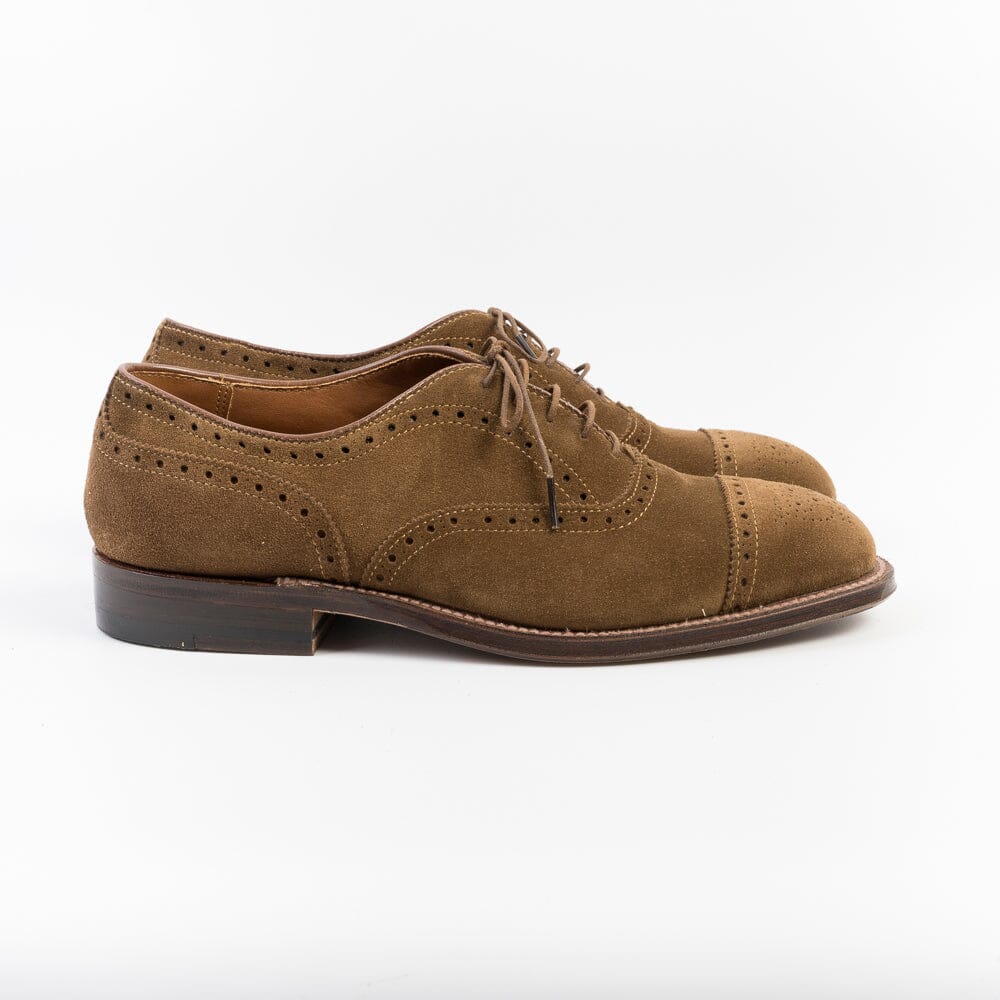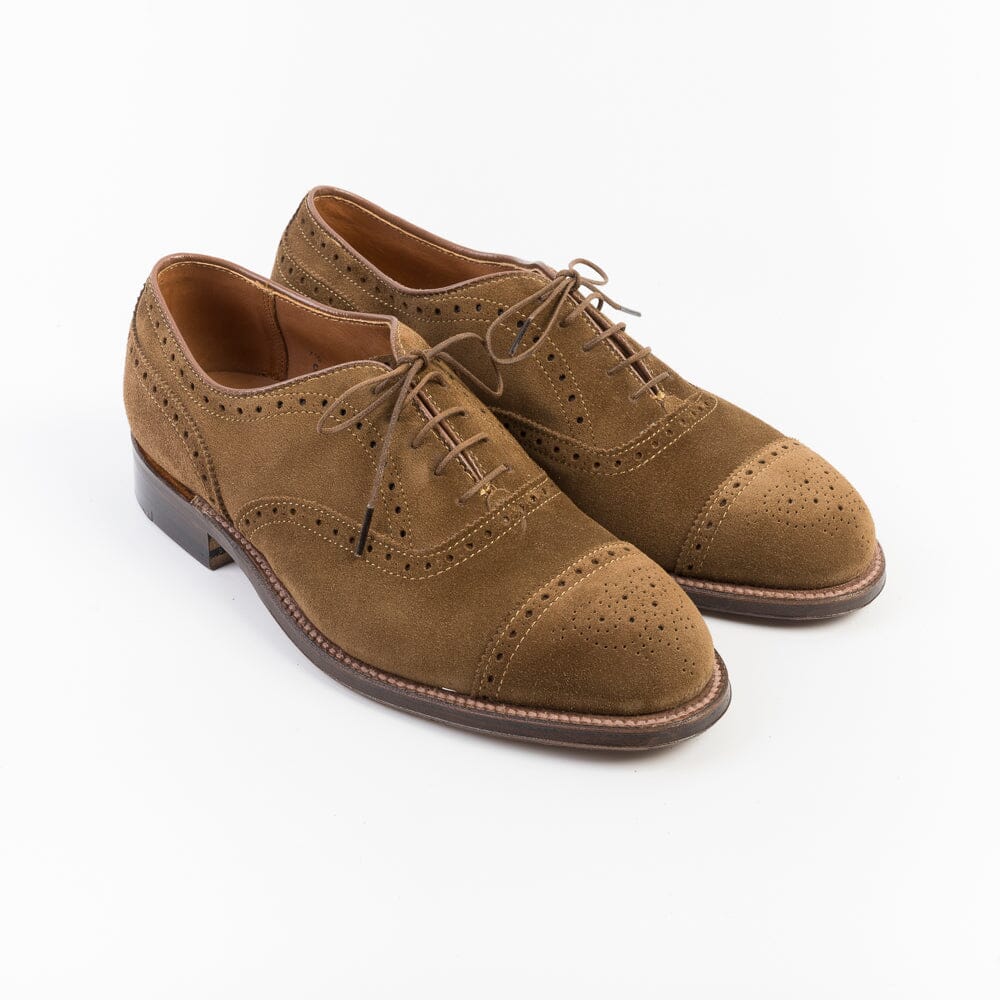 Francesine o Oxford realizzate in morbido camoscio di colore snuff con elegante e ricca decorazione duilio, lavorazione Goodyear, cucitura sul guardalo della calzatura, suola in cuoio. Forma Hampton, Calzata E. Morbidi lacci di cotone cerato in nuance.
