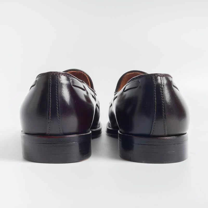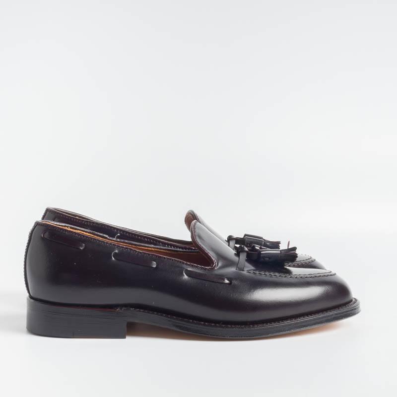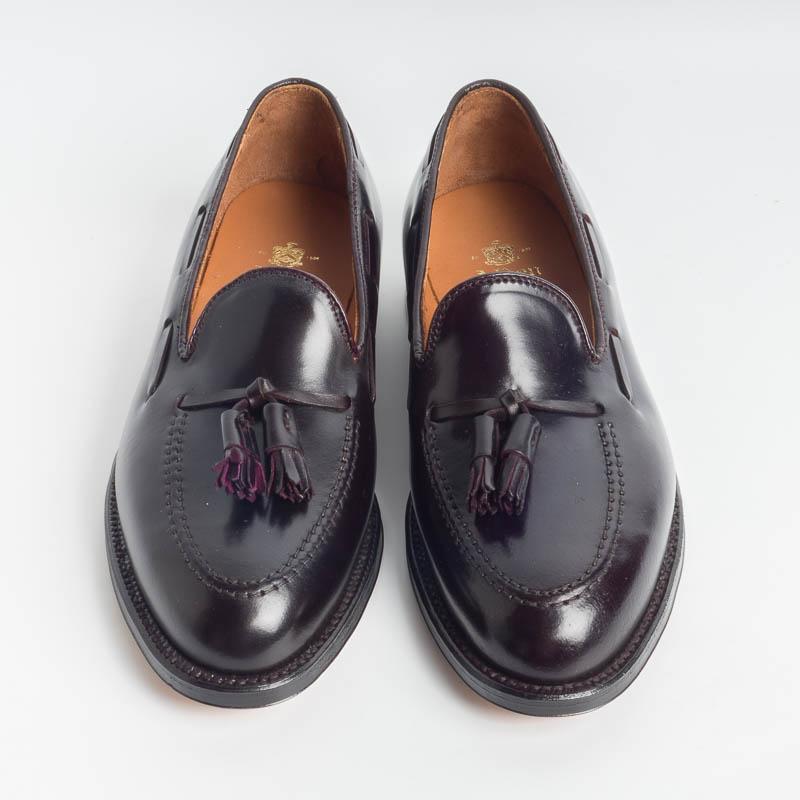 Mocassino con nappina di Alden realizzato in culatta di cavallo Horween di colore burgundy. Fondo con suola in cuoio. Lavorazione goodyear. Rivestimento interno in pelle. Forma Aberdeen