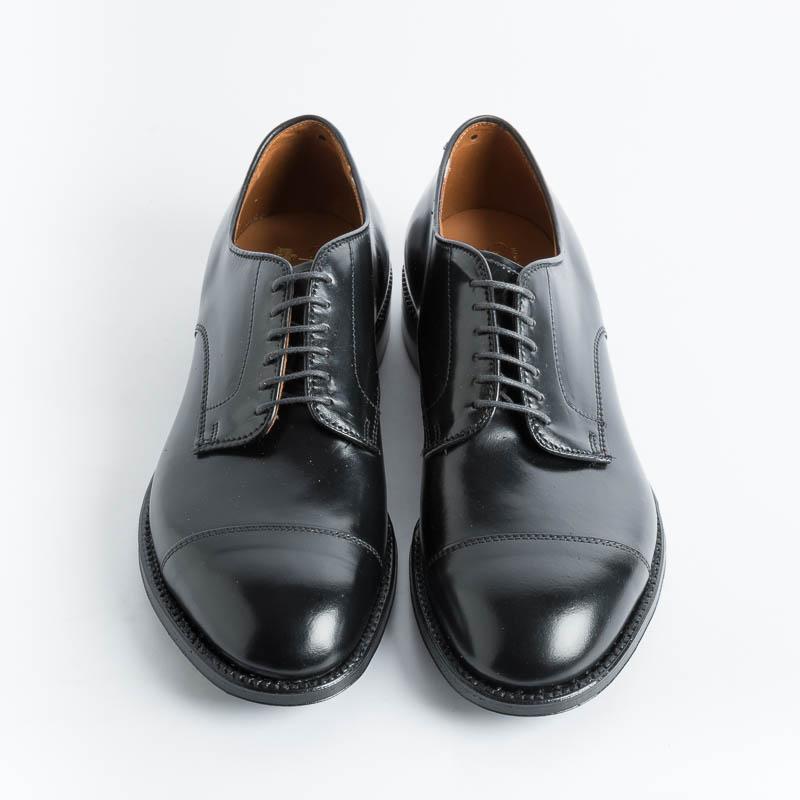 Calzatura Derby dalla forma ergonomica di Alden, realizzata in Culatta di Cavallo conceria Horween di colore nero con interno foderato in pelle di vitello. Lavorazione goodyear e fondo in cuoio. Lacci in cotone cerati in nuance. La calzata particolare di questa forma ergonomica (il lato interno รจ piรน alto rispetto a quello esterno della scarpa) la rende unica nel panorama mondiale della calzatura e necessita di una particolare assistenza per la prova.