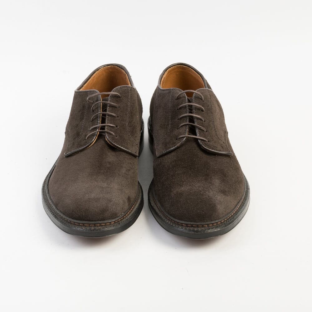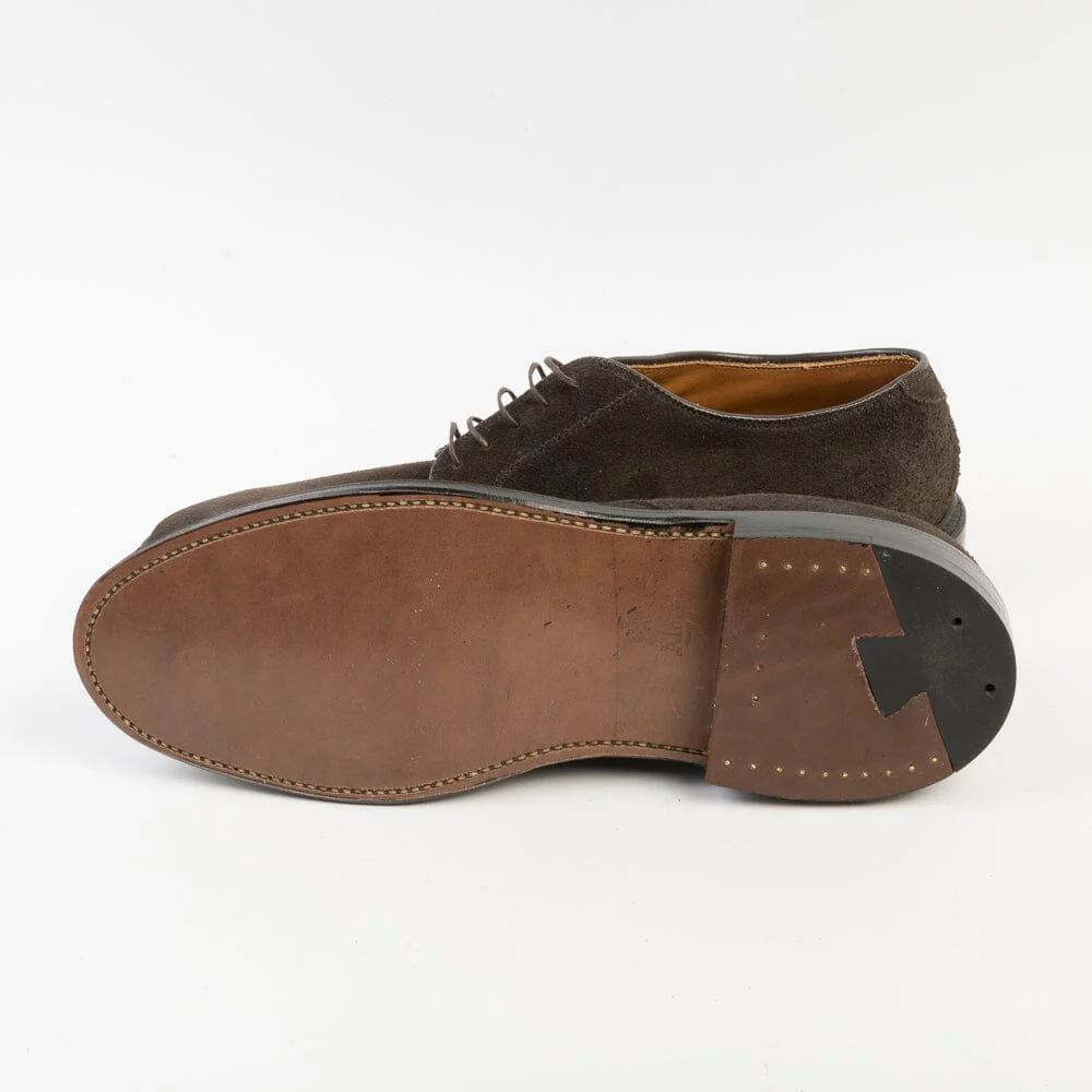 Scarpa derby liscia di Alden sfoderata, realizzata in camoscio di colore testa di moro, lavorazione goodyear, fondo oleato. Forma Barrie. Calzata E