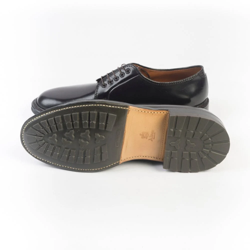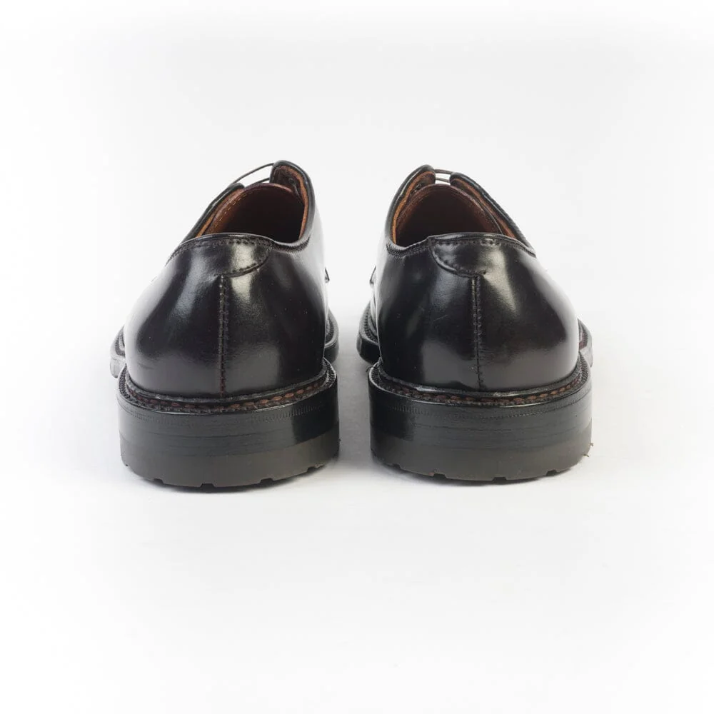 Classico derby liscio di Alden realizzato in Culatta di Cavallo (Horween ) di colore bordeaux. Cinque fori con occhielli in metallo in nuance e lacci cerati. doppia suola in cuoio, con inserto in gomma realizzata in esclusiva per CappellettoShop, guardolo con doppia cucitura Goodyear. Forma Barrie Last.