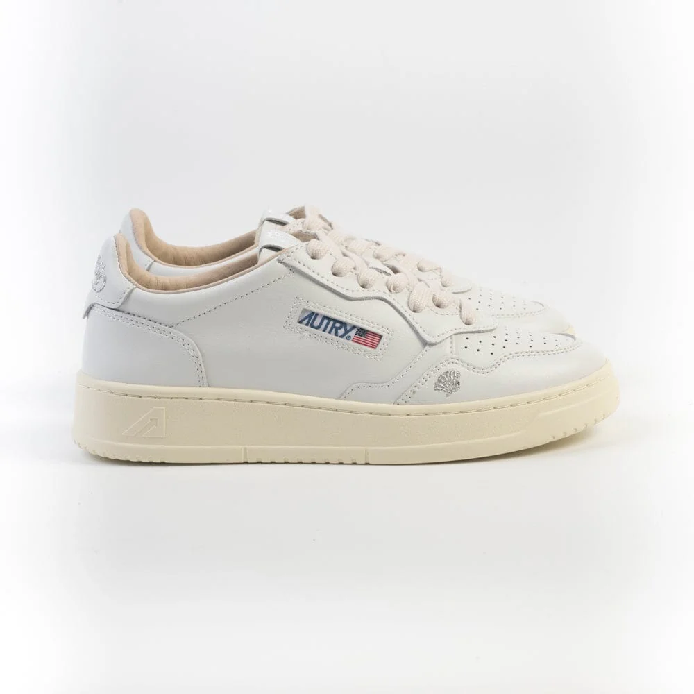 Iconica Medalist di Autry realizzata in pelle bianca, con piccolo dettaglio conchiglia sui lati esterni con filo ricamato di colore argento. Applicazione di logo del marchio con bandiera americana sui lati esterni. Tallone in pelle bianco con logo corsivo ricamato di colore argento. Dettaglio della fodera interna di colore beige. Suola in gomma di colore avorio. Plantare interno estraibile.