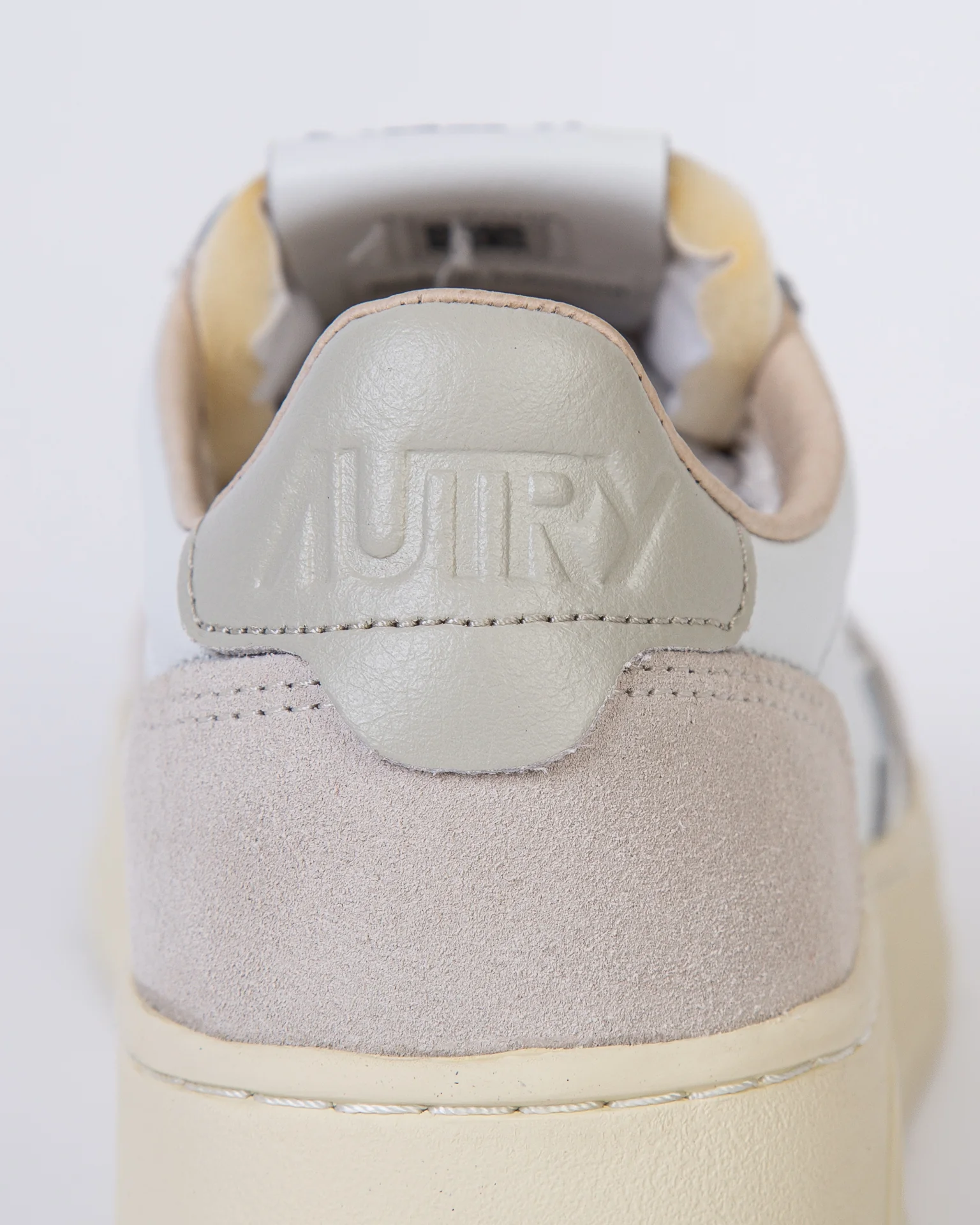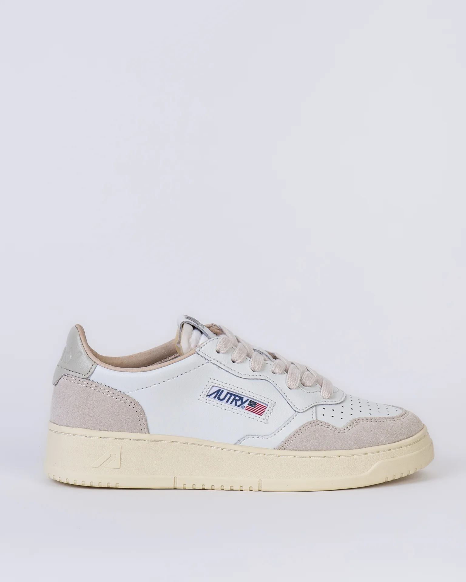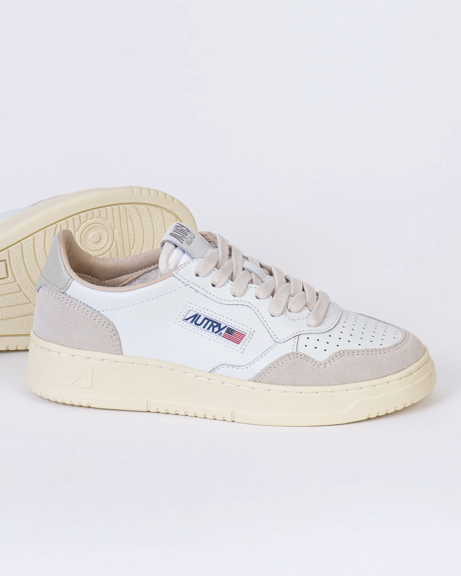 Autry, sneakers donna AULW-LS 14 bianco, medalist con tomaia in pelle e dettagli camoscio, talloncino color fango con logo. La scarpa scattata รจ una taglia 39