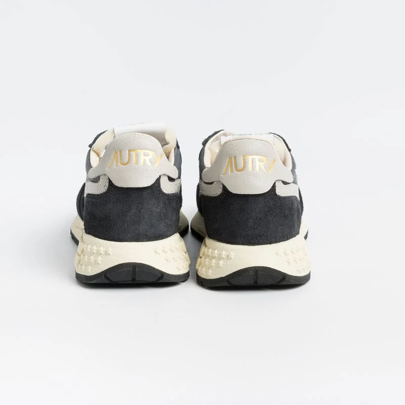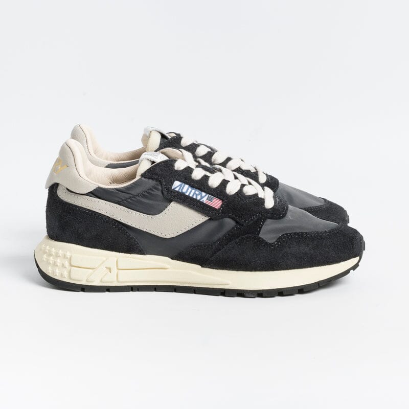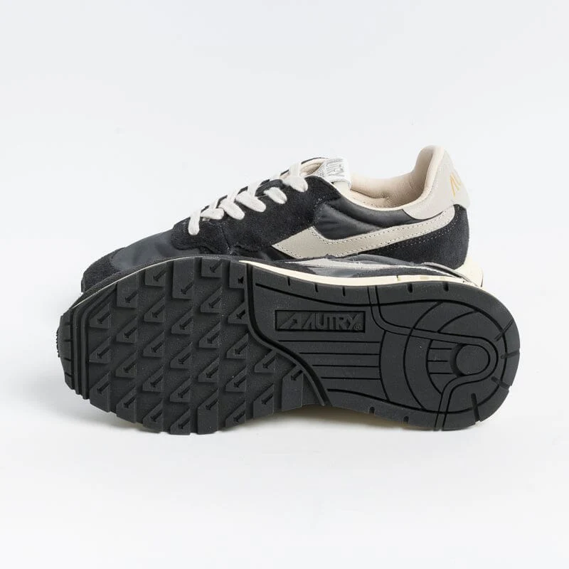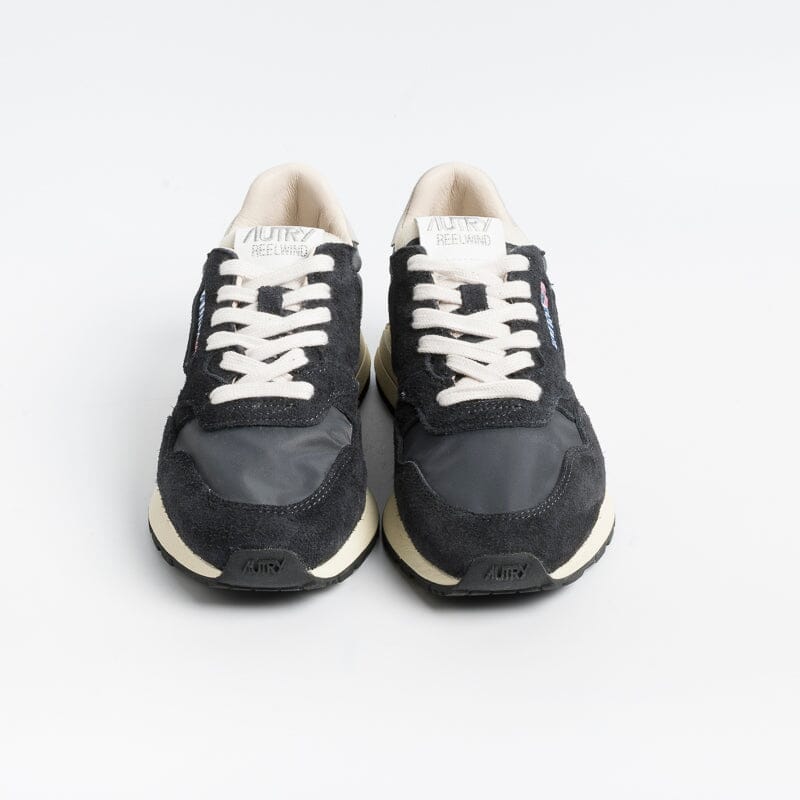 Nuova sneaker ReelWind di Autry, realizzata in camoscio e tessuto tecnico di colore nero, con dettagli in pelle craclรจ di colore grigio. Applicazione di logo del marchio con bandiera americana sui lati esterni. Suola ultraleggera in gomma Phylon, la quale offre comfort e versatilitร al tempo stesso. Lacci in cotone di colore bianco.