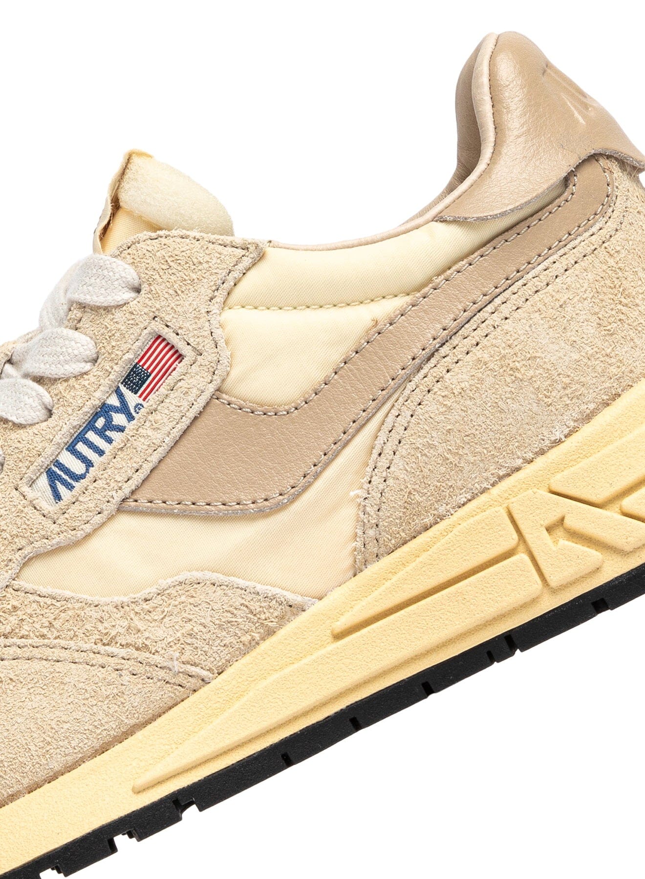Nuove sneakers ReelWind di Autry, realizzate in camoscio e pelle di colore beige, tessuto tecnico e mesh di colore avorio. Applicazione di logo del marchio con bandiera americana sui lati esterni. Lacci in cotone di colore avorio. Suola ultraleggera in gomma Phylon, la quale offre comfort e versatilitร al tempo stesso.