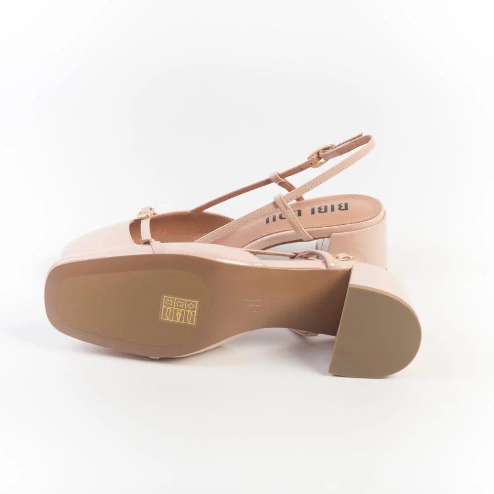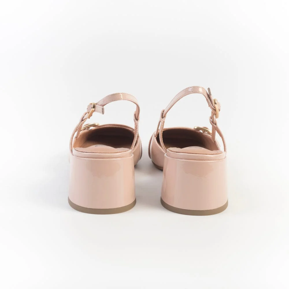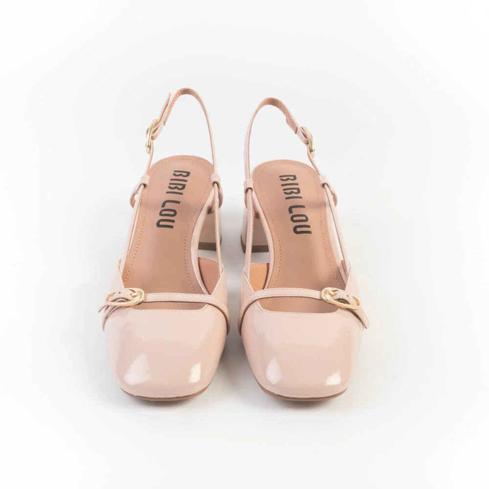 Sling Back a punta squadrata di Bibi Lou , realizzata in vernice di colore nudo. Chiusura con cinturino regolabile sul tallone. Ulteriore cinturino sull’avampiede. Interno foderato in pelle. Sottopiede in pelle, tacco rivestito di cm. 5, suola con inserto in gomma.