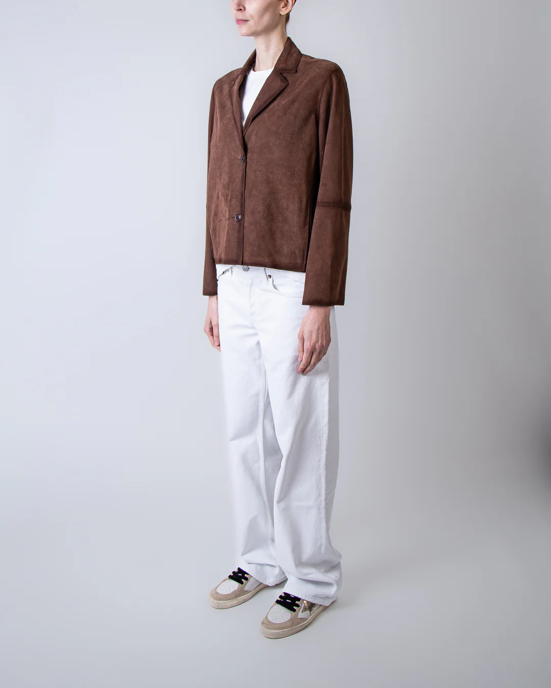 Bully, giubbotto donna 8730 BLS CACAO marrone, giacca in suede con cintura. La modella รจ alta 175cm e indossa la taglia 40