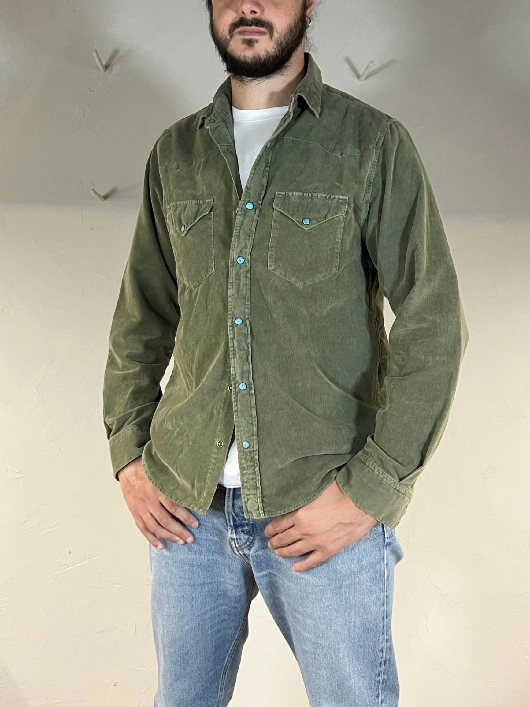 Codice Articolo: CHSPKAI25-506 Colore: Military Modello western Tasche frontali Allacciatura con bottoni automatici Vestibilitร regular Composizione: 100% Cotone Taglia indossata L (Modello: Altezza 188cm)