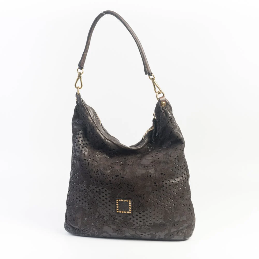 Borsa a spalla Tecla di Campomaggi in vacchetta naturale tinta in capo di colore testa di moro con lavorazione laser effetto pizzo. Unico manico tubolare in pelle da portare a spalla. Chiusura principale con zip. Interno foderato in tessuto, taschina interna con chiusura a zip e piccola taschina porta telefono. Tracolla in pelle regolabile con moschettoni di metallo di colore oro brunito per essere portata a tracolla. Applicazione di iconica label del brand sul retro. In dotazione kit di pulizia/crema di nutrimento per il pellame e borsa in tessuto.