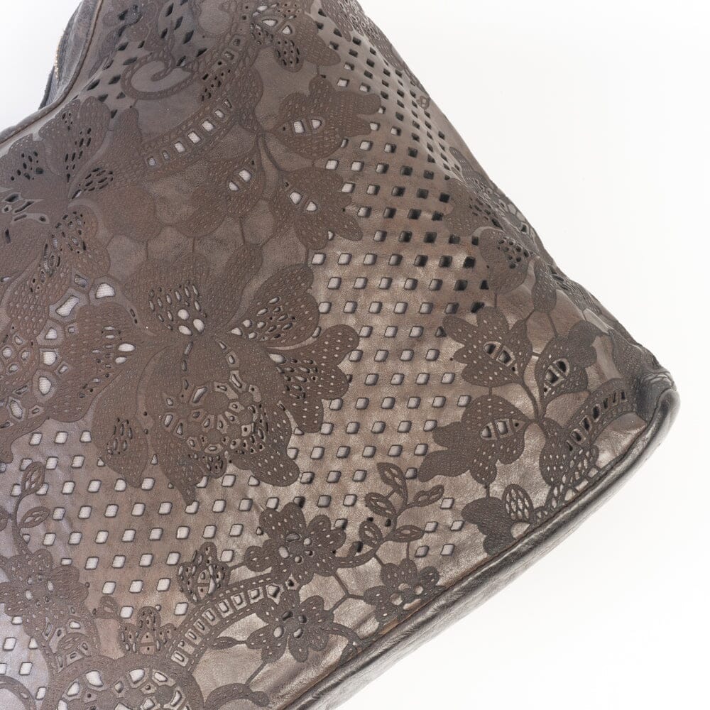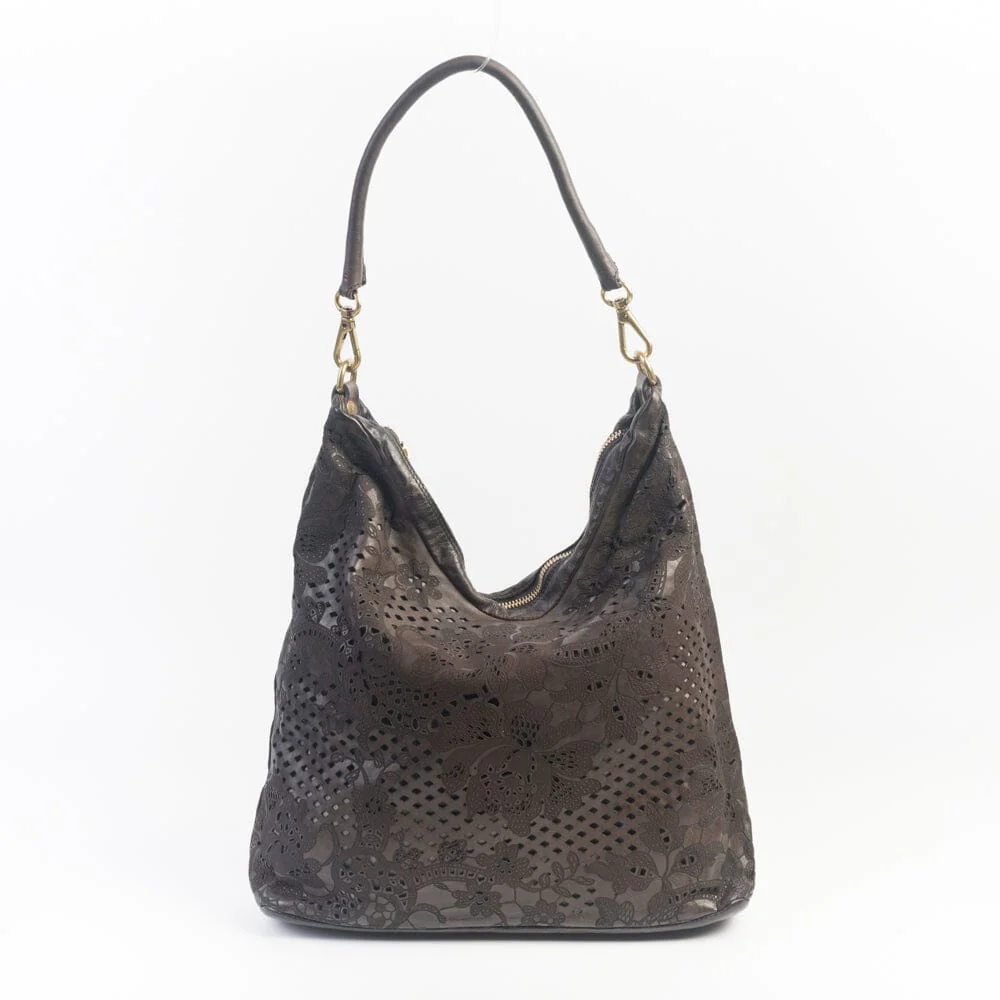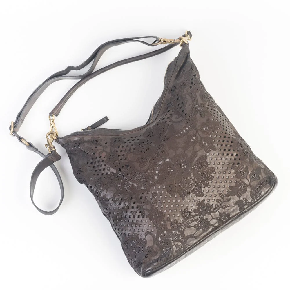 Borsa a spalla Tecla di Campomaggi in vacchetta naturale tinta in capo di colore testa di moro con lavorazione laser effetto pizzo. Unico manico tubolare in pelle da portare a spalla. Chiusura principale con zip. Interno foderato in tessuto, taschina interna con chiusura a zip e piccola taschina porta telefono. Tracolla in pelle regolabile con […]