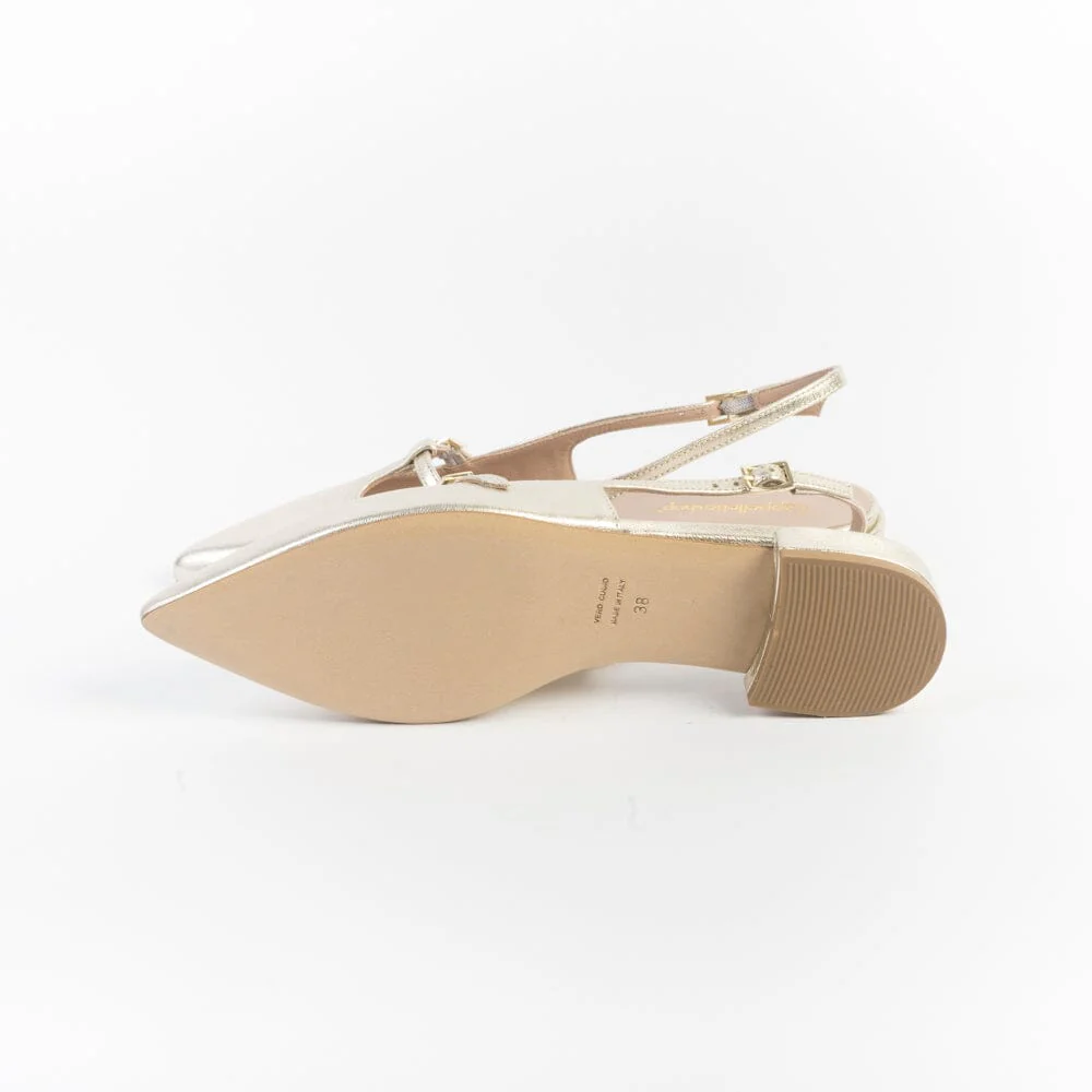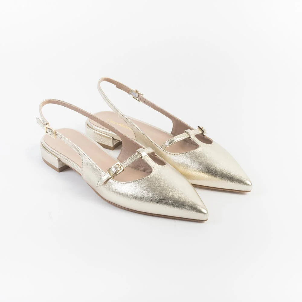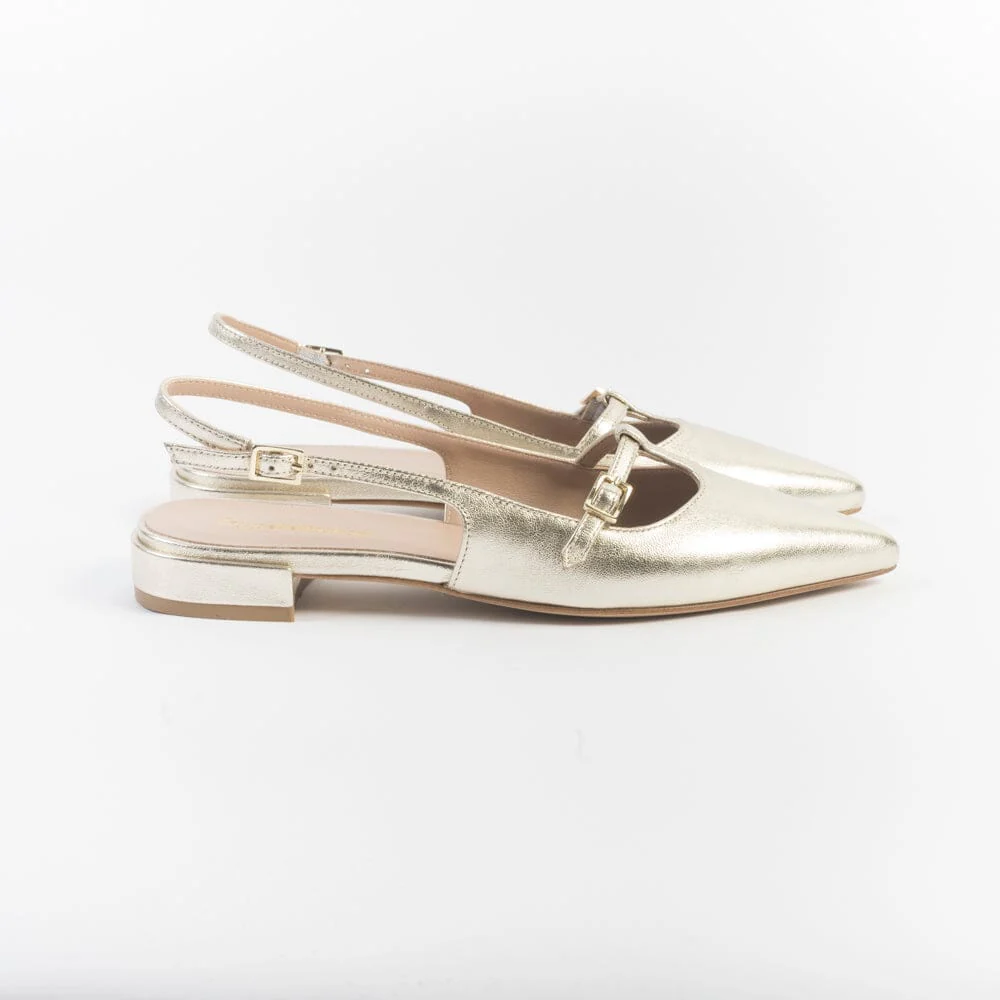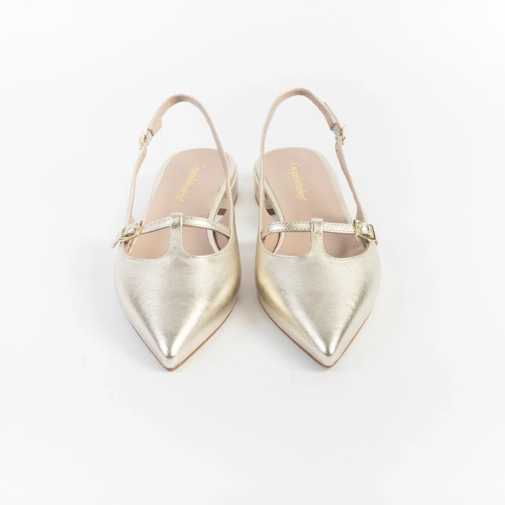 Sling back realizzata per CappellettoShop in morbida nappa laminata di colore platino. Chiusura con cinturino regolabile sul tallone e decorazione con cinturino a T stile bebรจ sull’avampiede . Fodera interna in pelle. Tacco di altezza 2,5 cm, suola in cuoio.