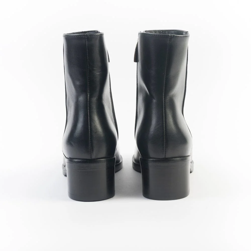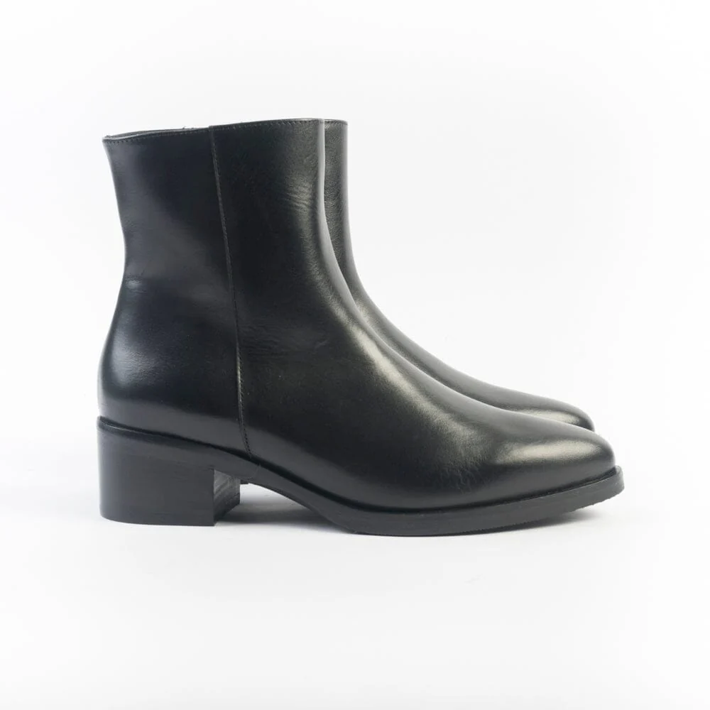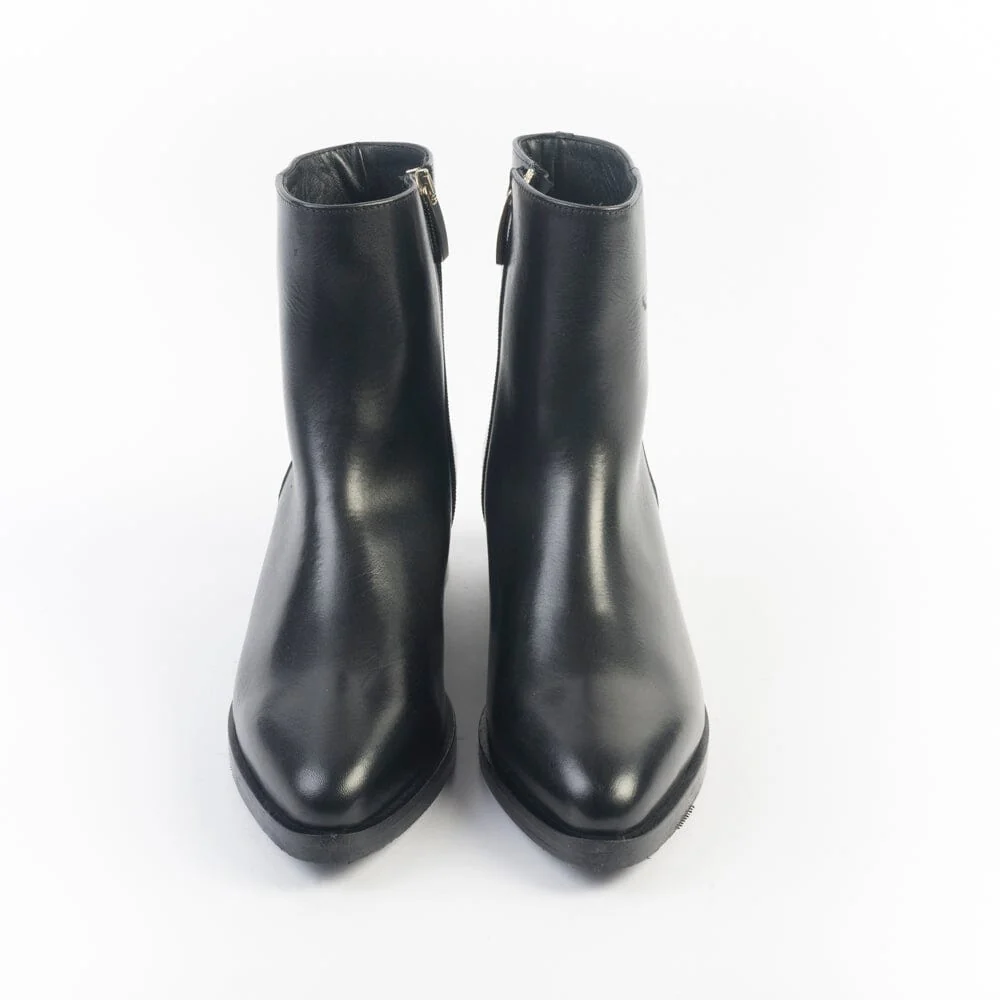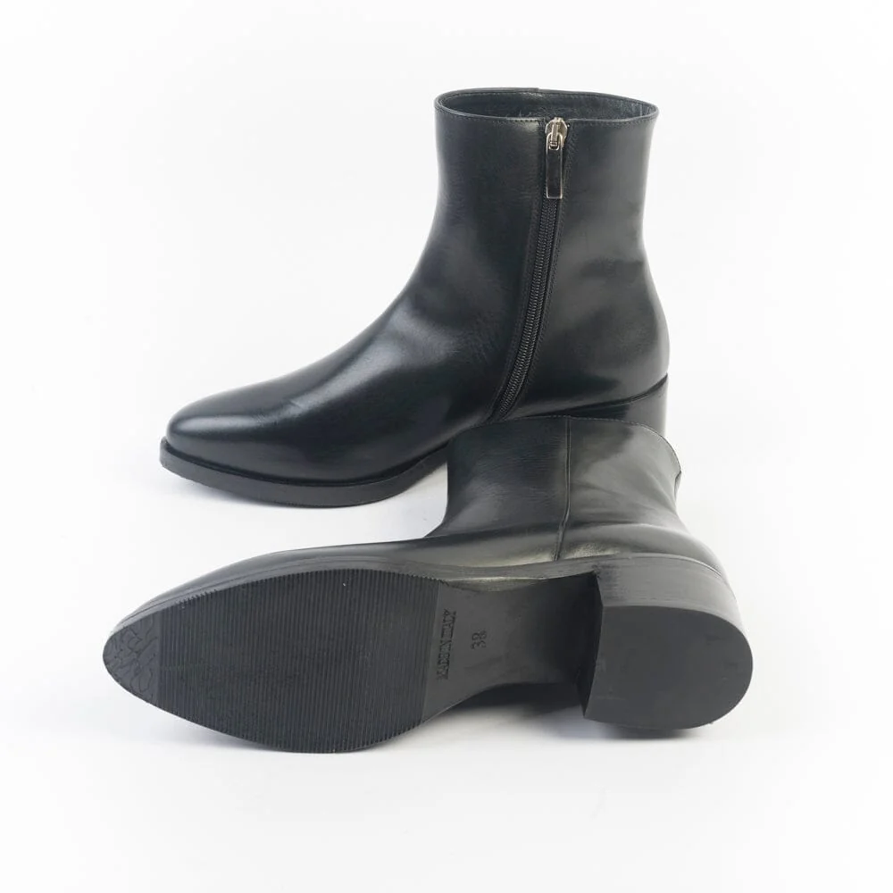 Stivaletto realizzato per Cappellettoshop in pelle di colore nero. Dotato di zip nel lato interno per un totale comfort della calzata. Punta affusolata, interno e sottopiede in pelle. Suola in gomma antiscivolo e tacco legno di 5 cm.