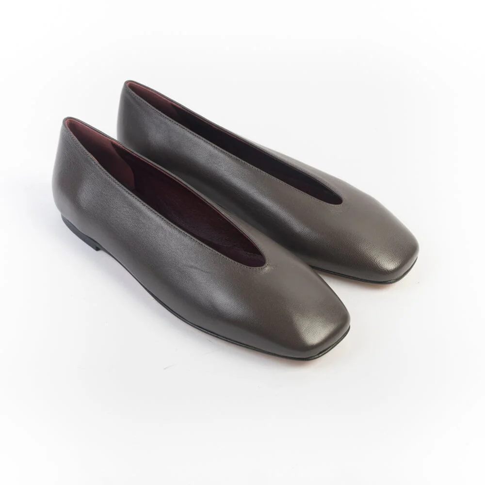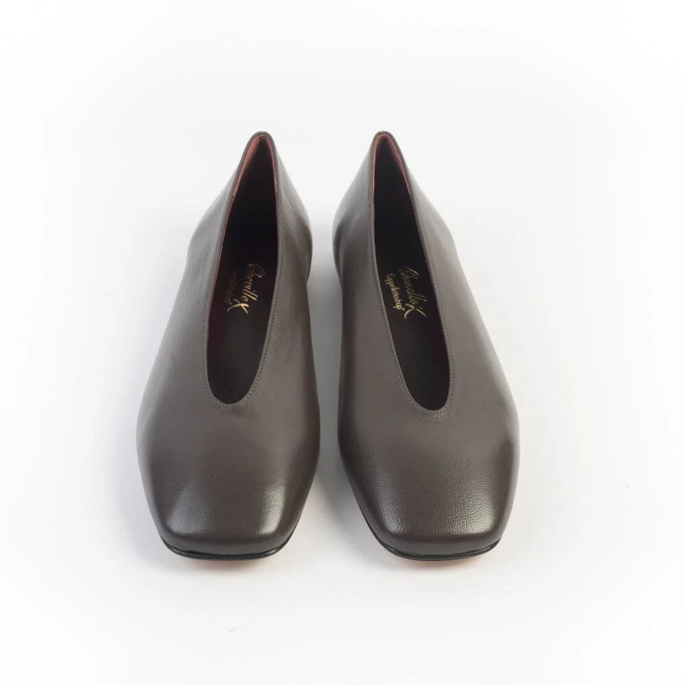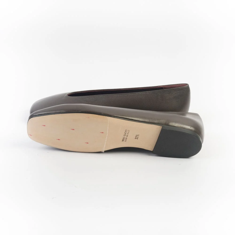 Ballerina di Cheville realizzata per Cappellettoshop in pelle di colore moka con punta squadrata e tomaia accollata stile retrรฒ. Sottopiede in pelle. Suola in cuoio.