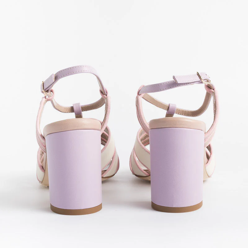 Sandalo a fasce di Cheville per Cappellettoshop, realizzato in morbidissima pelle di colore bianco, rosa e glicine. Chiusura con cinturino a T alla caviglia. Tacco a colonna foderato in pelle di altezza cm 8. Sottopiede in pelle in nuance. Suola in cuoio.