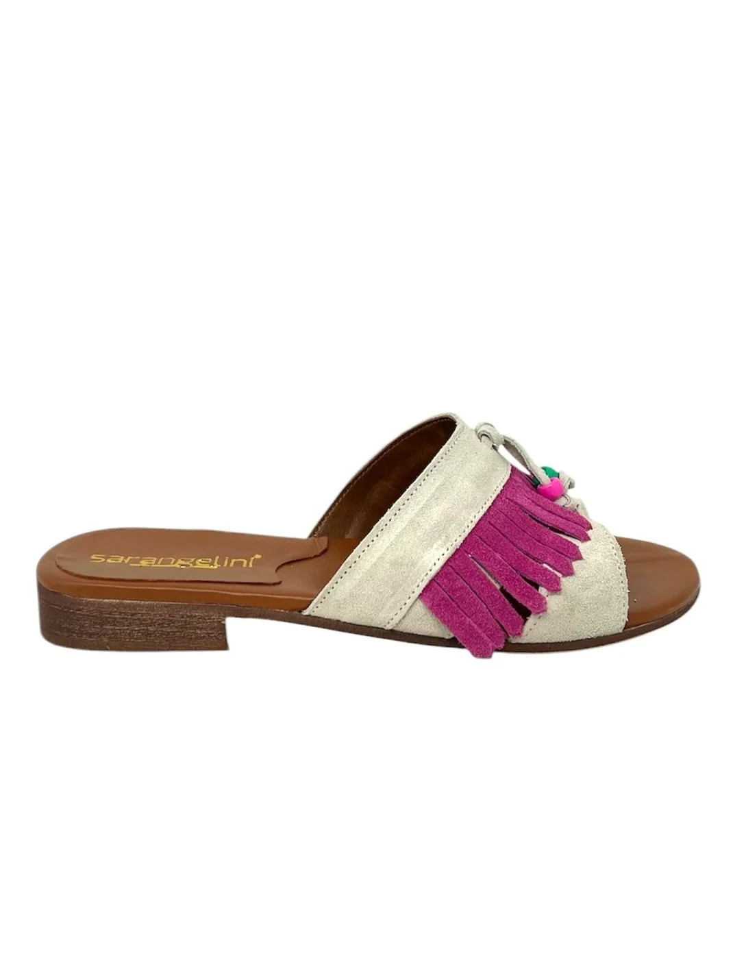 Realizzate in morbida pelle di camoscio, le nostre ciabattine flat con frange fucsia sono il perfetto mix tra comfort e stile. Con pelle pregiata e frange di tendenza, queste ciabattine sono perfette per un look casual chic. Prodotte in Italia, garantiscono qualitร e raffinatezza.