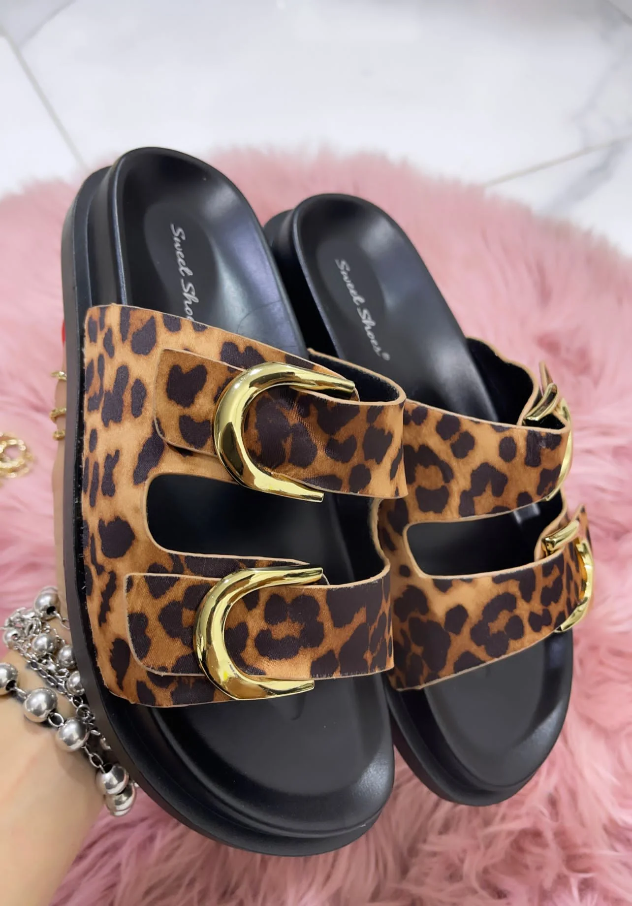 “Ciabatta Ischia Leopard รจ una scarpa in gomma con una stampa leopardata unica e una fibia doppia in oro. Lasciati conquistare dal mix tra eleganza e comfort che questa ciabatta unica puรฒ offrire.”