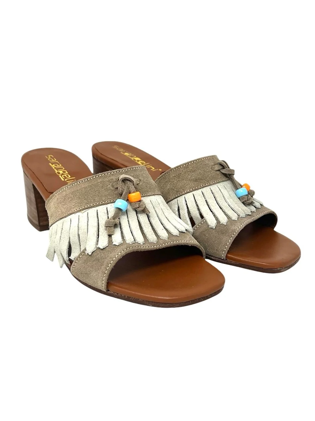 Le nostre ciabattine tacco 5cm con frange ghiaccio sono realizzate in pregiata pelle e camoscio made in Italy. Perfette per un look raffinato e di tendenza. Calzata regolare.