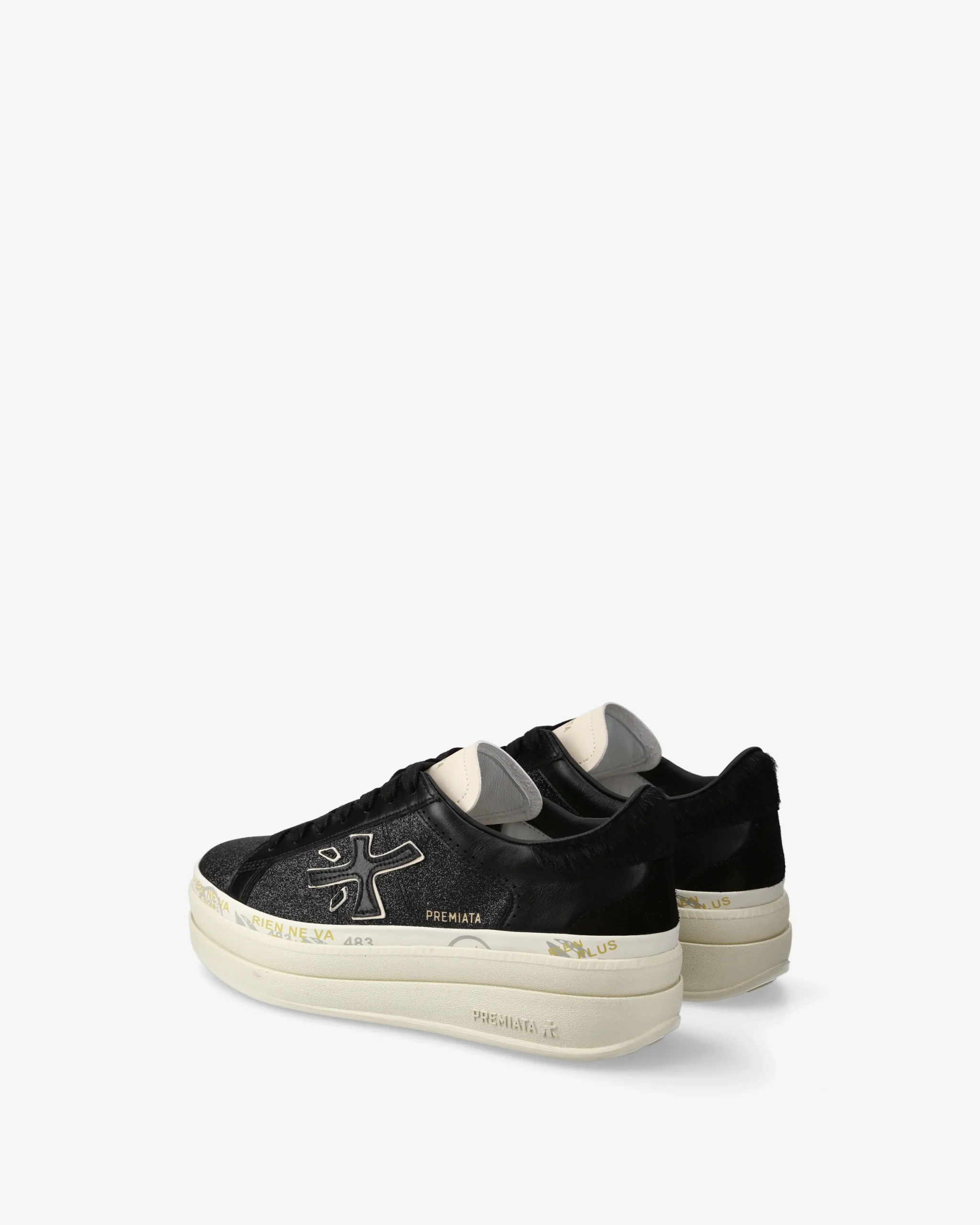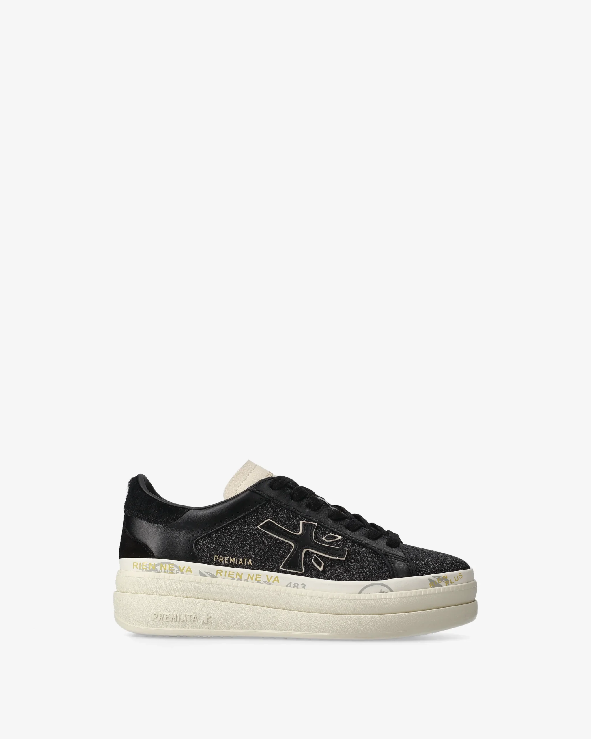 One of Premiata’s new must-haves. Style reaches new heights, combining designs such as the double-layer platform sole with a midsole embellished with the brand’s iconic stamps.