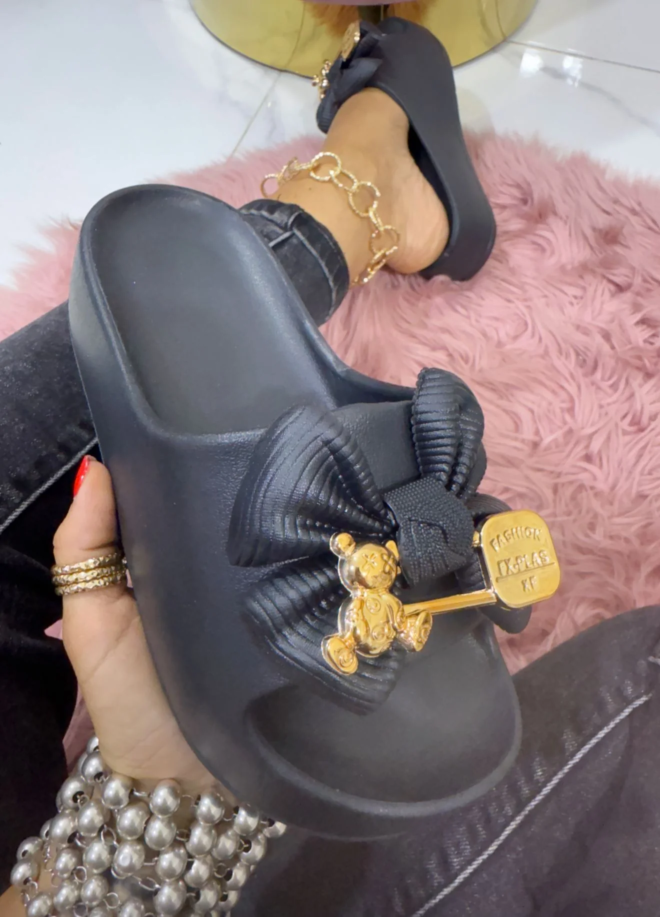 Ciabatta Colombia รจ una ciabatta in gomma con un fiocco in tessuto e accessori in oro. Suola alta 7 cm. Lasciati conquistare da questa ciabatta unica per accompagnare le tue giornate estive.