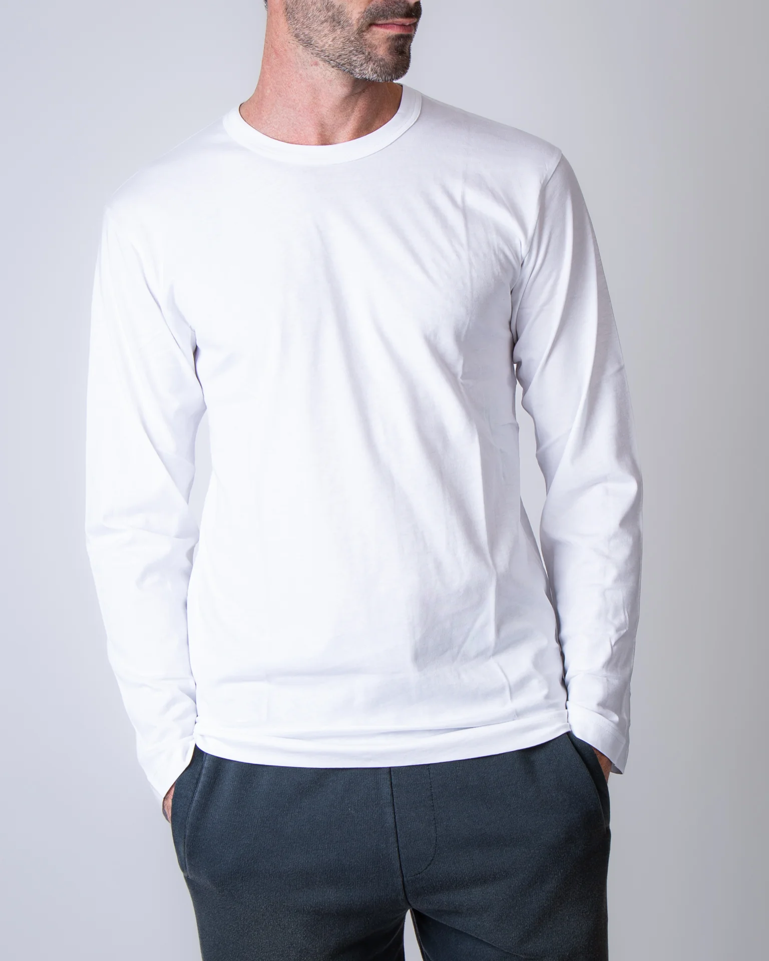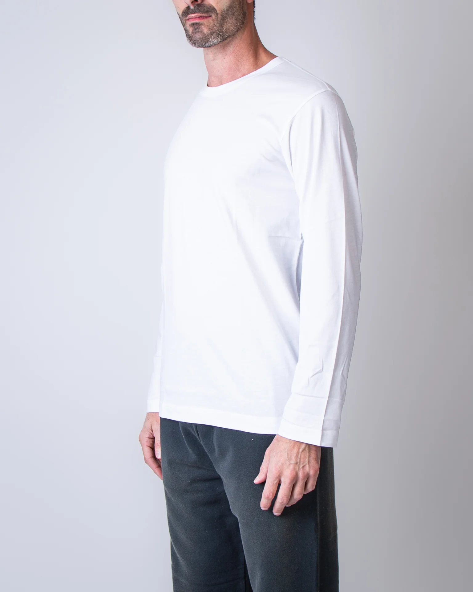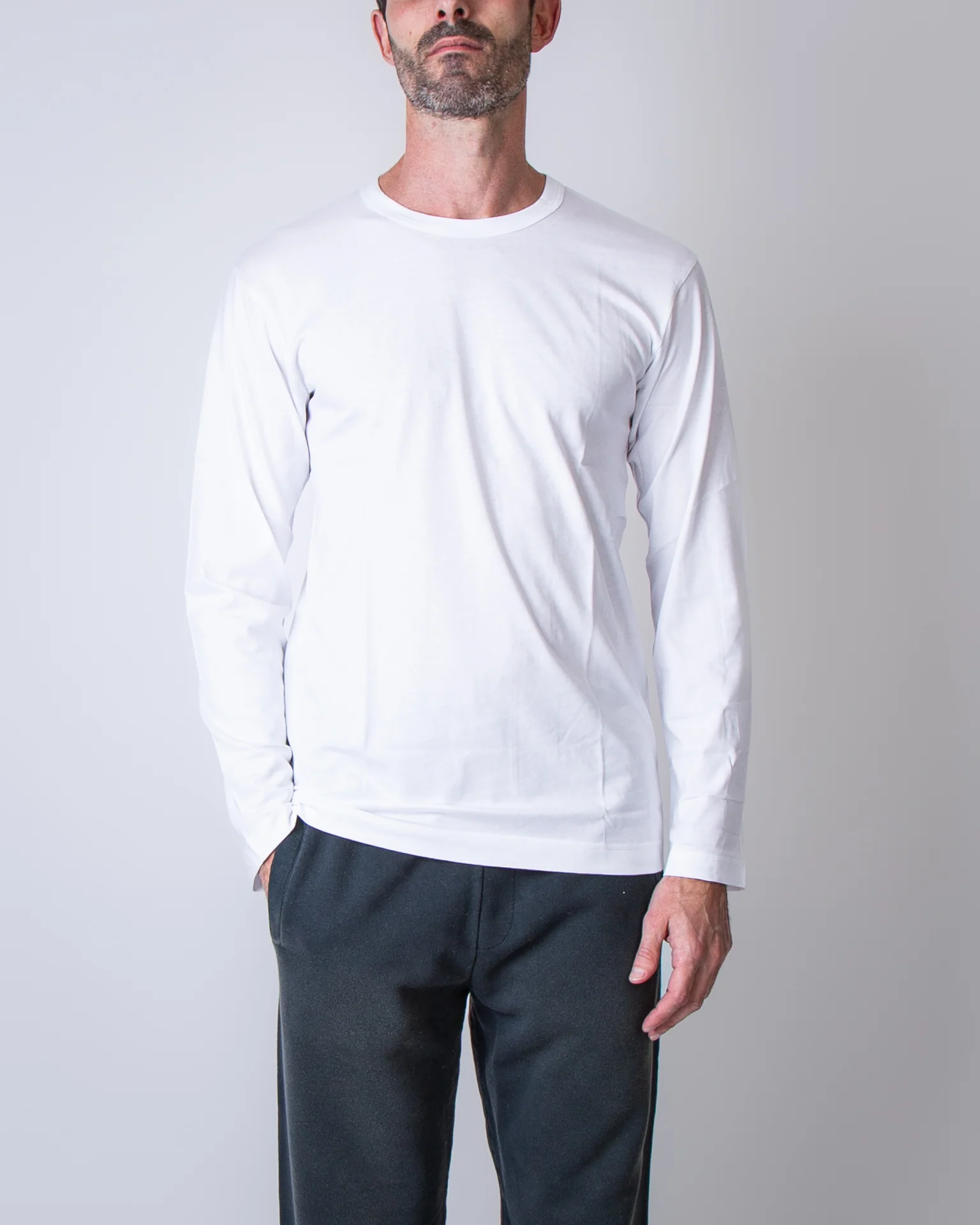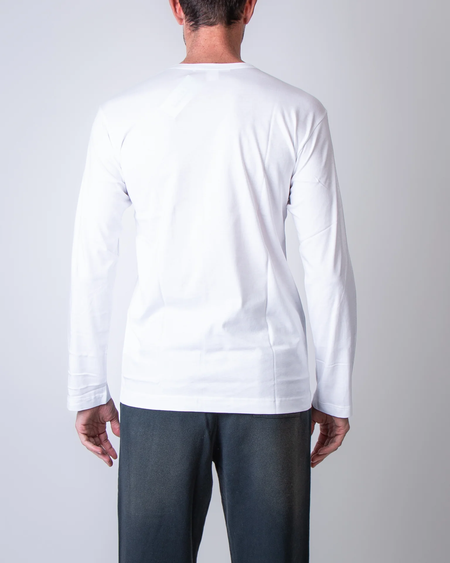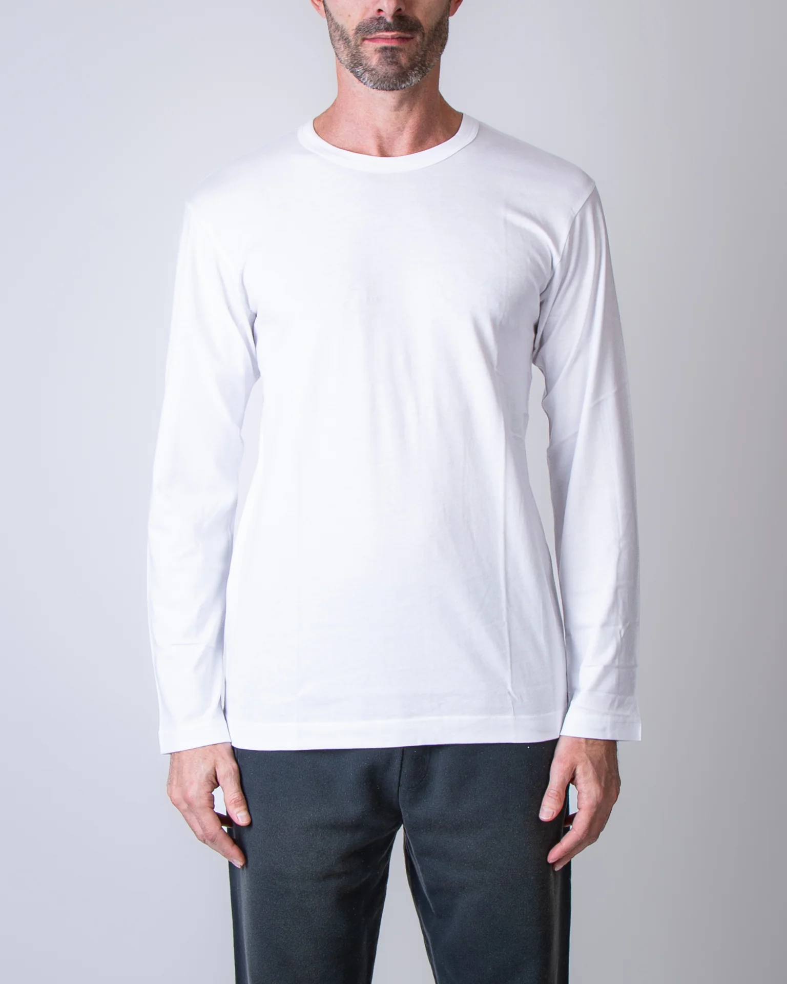 Comme Des Garcons Shirt, t shirt uomo FZ-T001 WHITE bianco, manica lunga, girocollo, 100% cotone. Il modello รจ alto 186 cm e indossa la taglia L