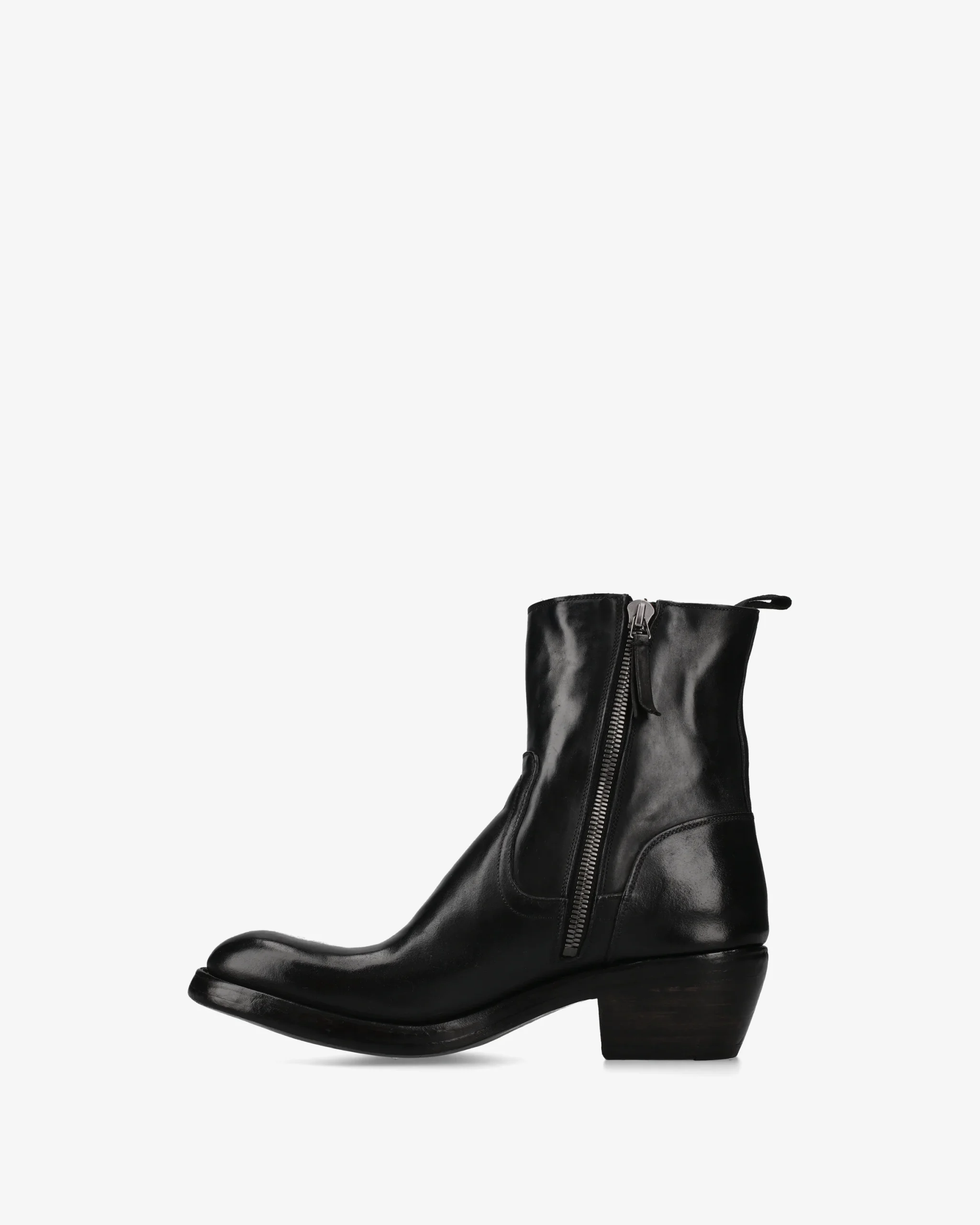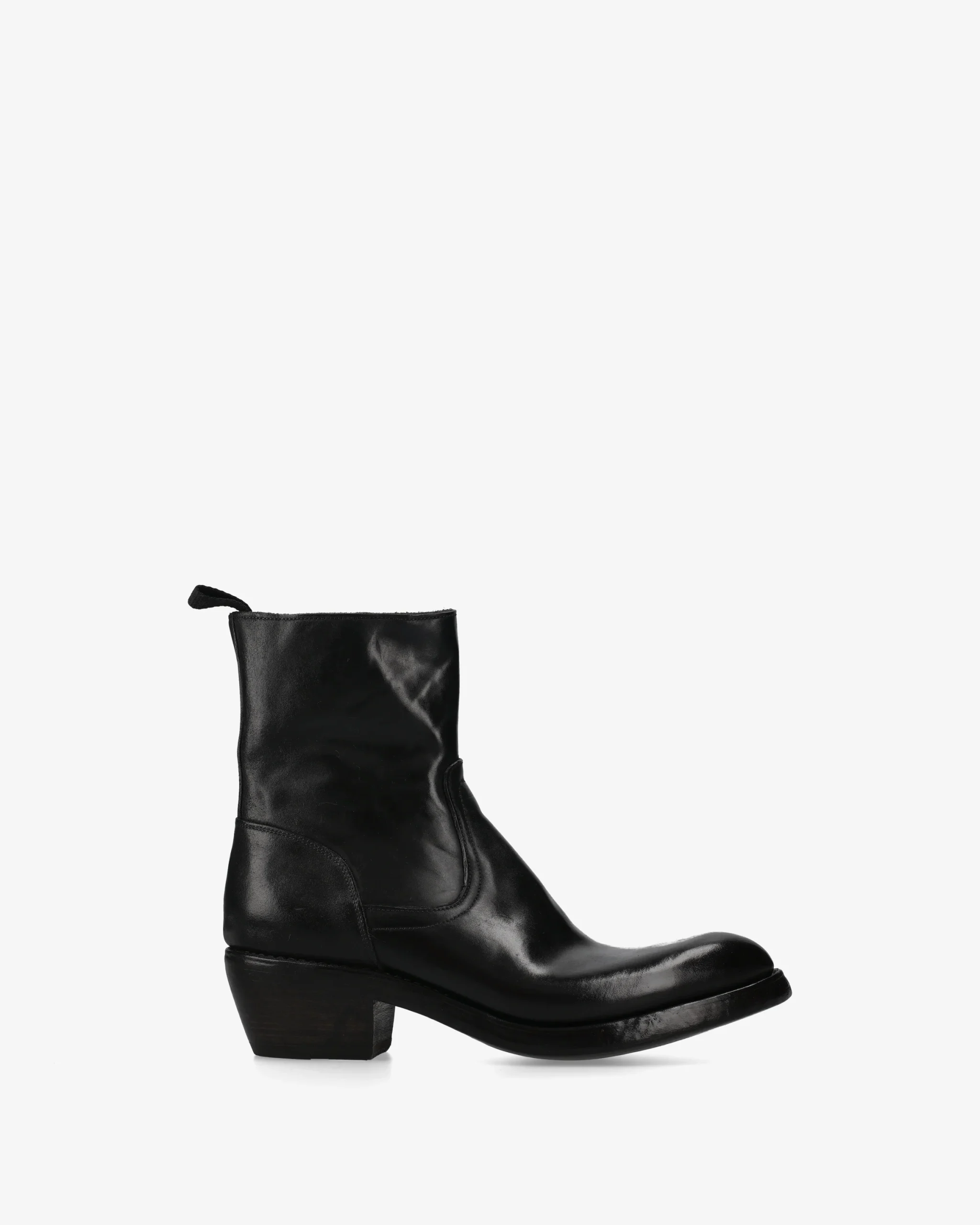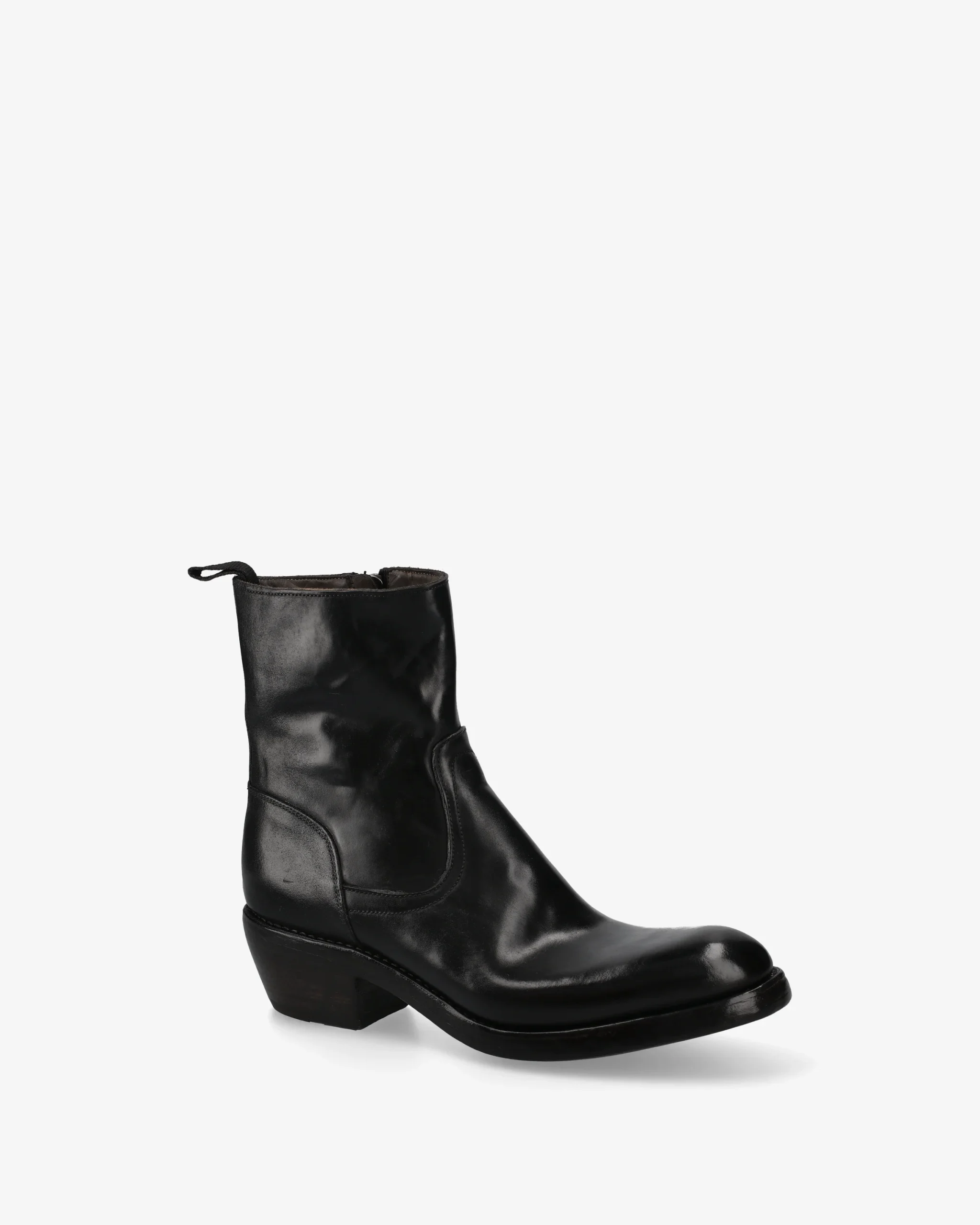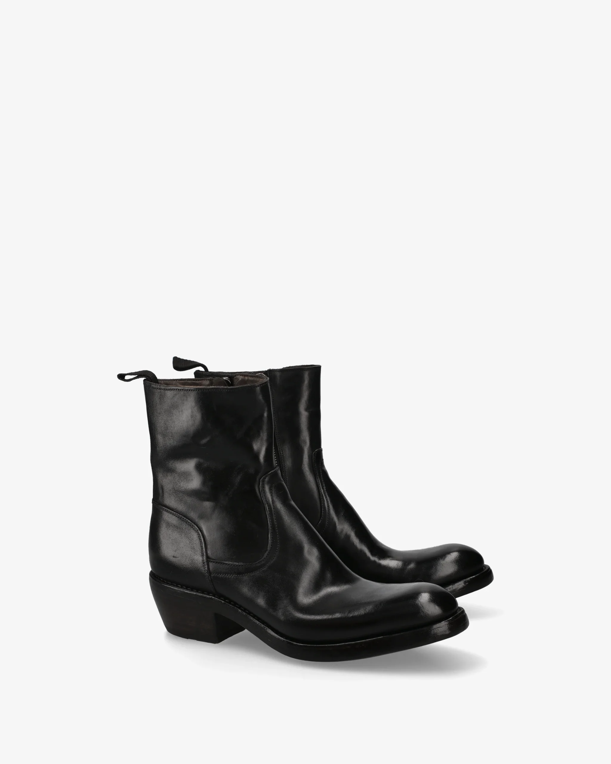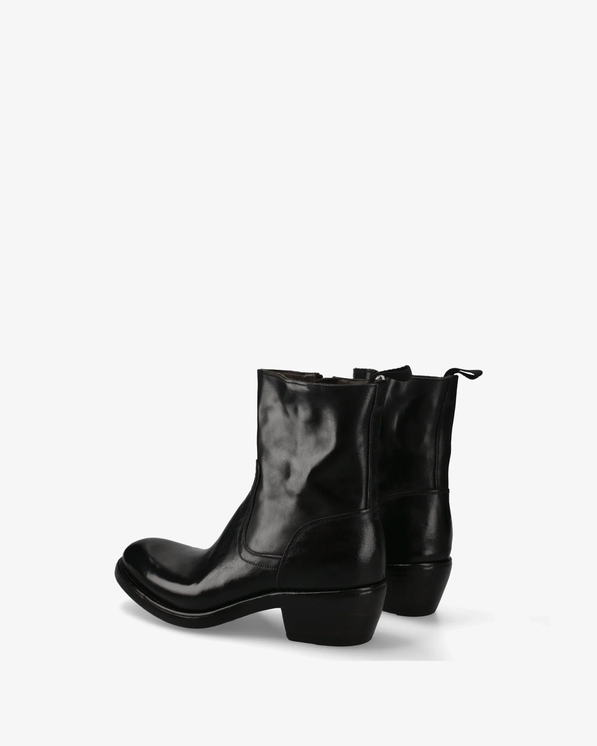 Rebellious elegance and masterful craftsmanship come together in this mid-calf boot. Featuring a bold silhouette and a slightly shiny finish, this model reworks the aesthetics of the classic Western-inspired boot in a contemporary and avant-garde key. Fine cordovan leather Clean lines Cuban heel in layered leather Leather sole with handcrafted welt Practical rear eyelet
