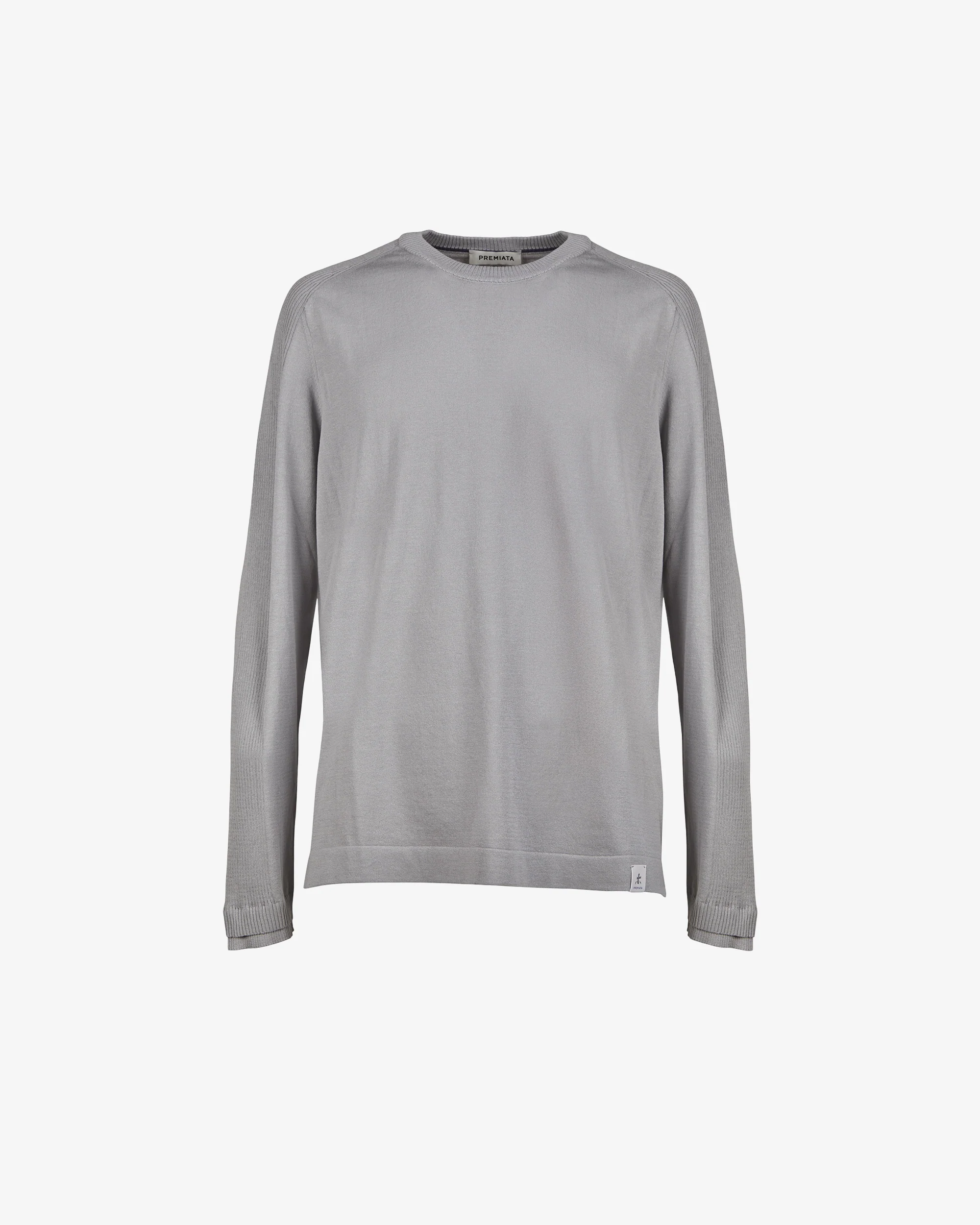 Essential crew neck sweater made from fine 30/2 cotton crepe. The 18-gauge single-thread construction ensures superior lightness and a cool feel, making it an essential piece for sophisticated, breathable layering.