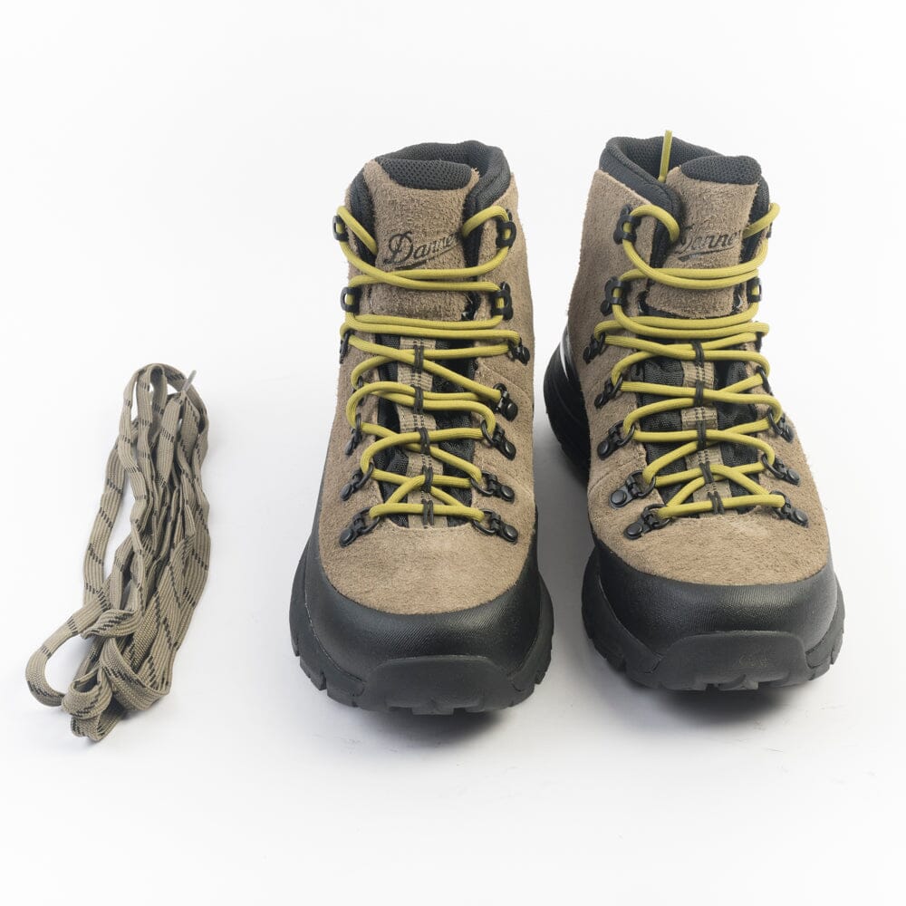 Scarponcini Danner realizzati con tecnologia GORE-TEX impermeabile e camoscio di colore verde militare. Dettagli in gomma nera sul puntale e tallone per proteggere dagli urti. Allacciatura con anelli a D e ganci, morbidi lacci in cotone di colore verde acido, piรน lacci piatti di colore verde militare. Suola in VIBRAMยฎ con mega-grip e soletto Ortholite.