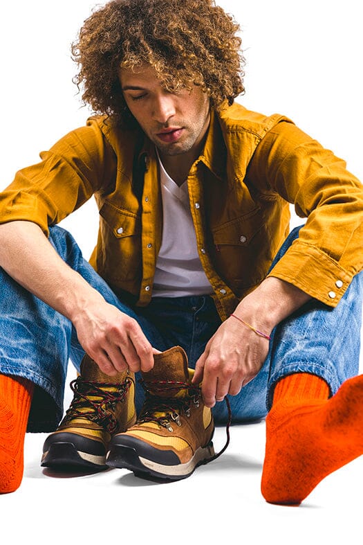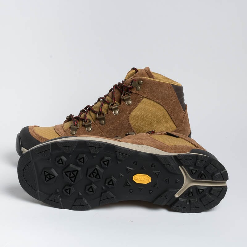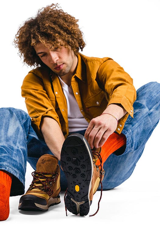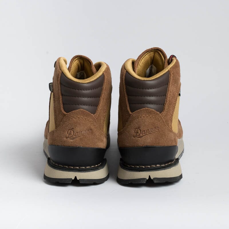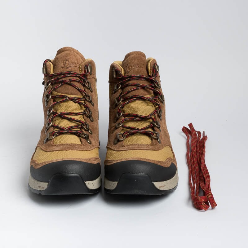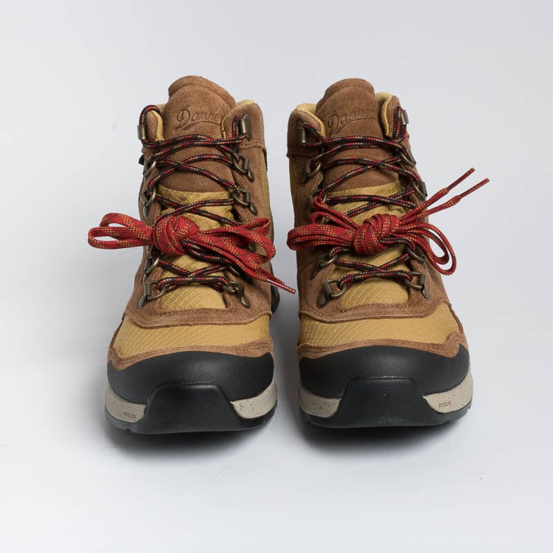 Scarponcino alla caviglia di Danner realizzato in tessuto GORE-TEX impermeabile di colore giallo ocra e camoscio di colore cuoio. Dettagli in gomma nera sul puntale e tallone per proteggere dagli urti. Allacciatura con anelli a D e gancio; morbidi lacci in cotone di colore rosso-nero, piรน lacci di ricambio in dotazione, sempre di colore rosso. Suola in VIBRAMยฎ con mega-grip e soletto interno in Ortholite.