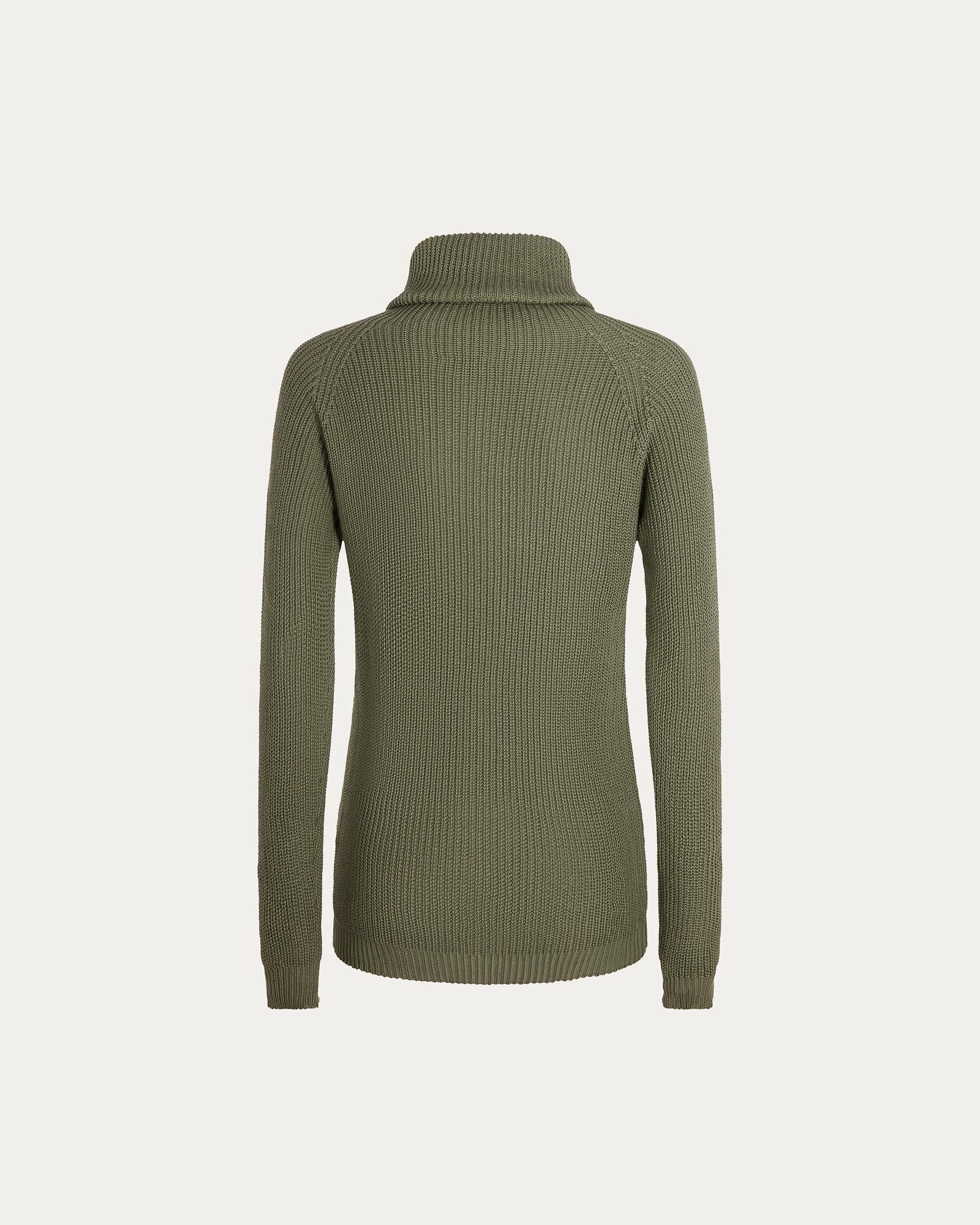 Maglione dolcevita sostenibile in 100% cotone organico realizzato con una fibra di qualitร superiore controllata e testata ad ogni raccolto.