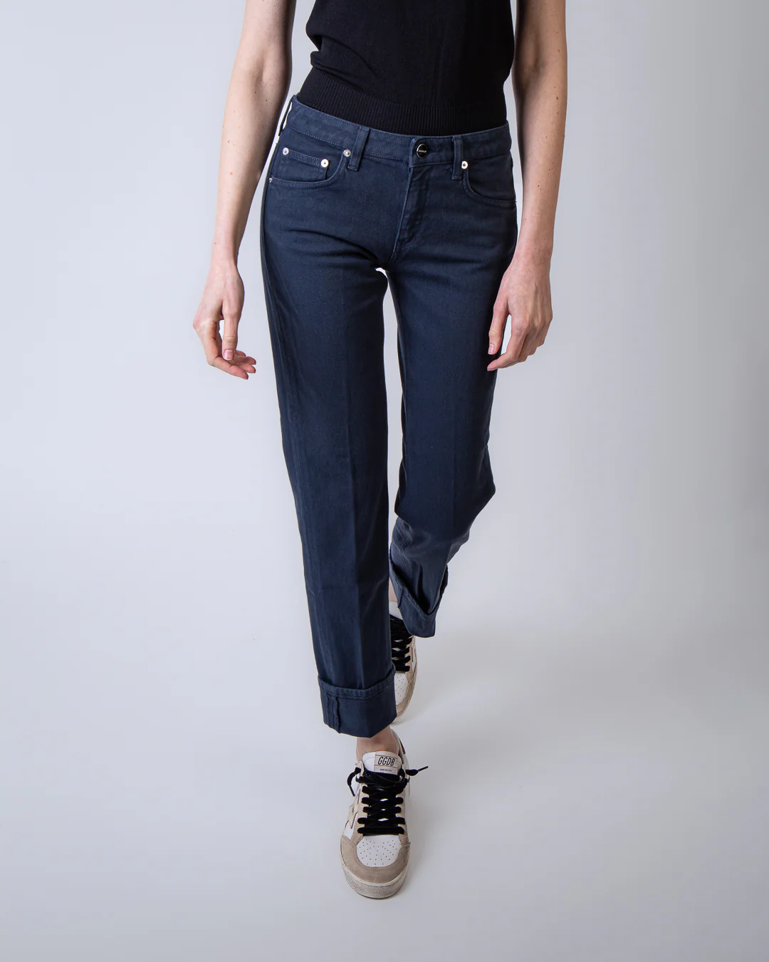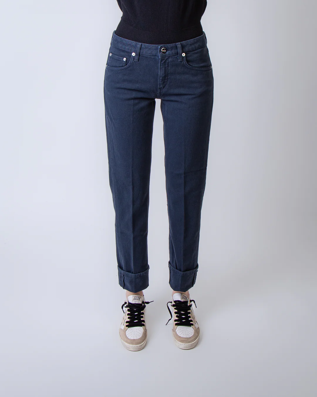 Dondup, jeans donna DP801 BSE037D KTP 890 blu, modello coco slim fit. La modella รจ alta 175cm e indossa la taglia 26