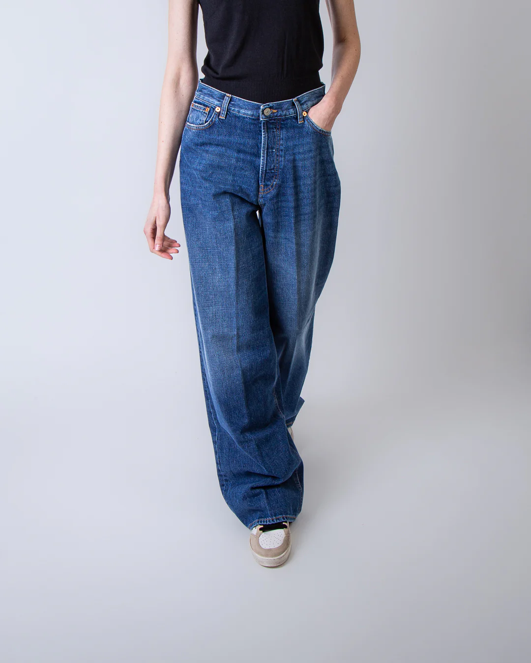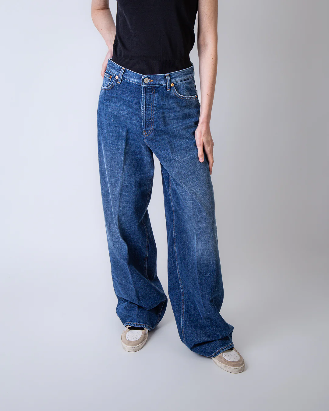 Dondup, jeans donna DP849 DF0283 MA9 800 blu, modello dakota. La modella รจ alta 175cm e indossa la taglia 26