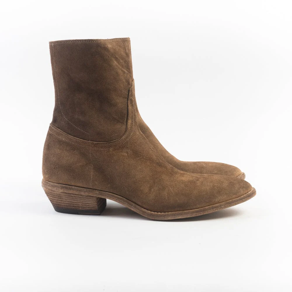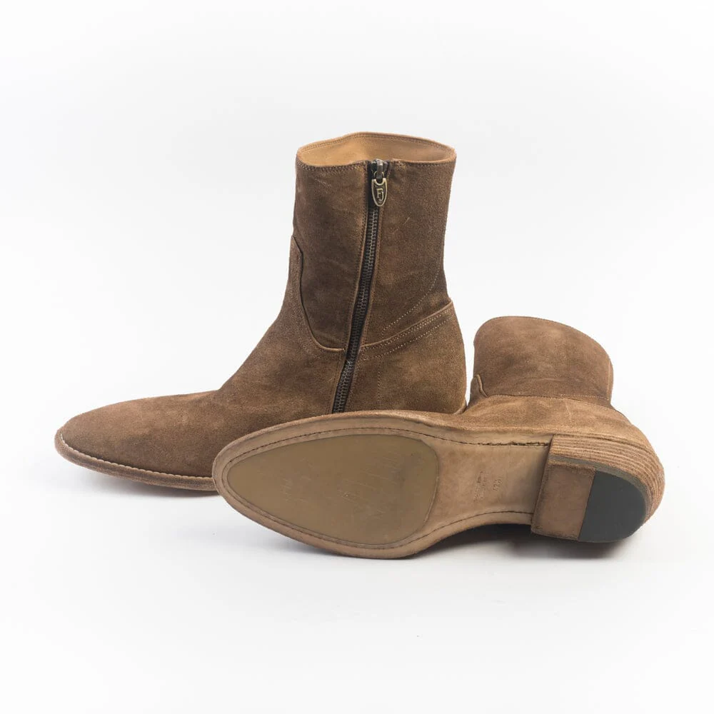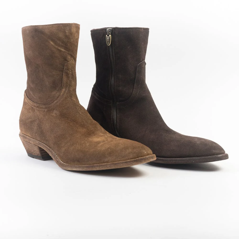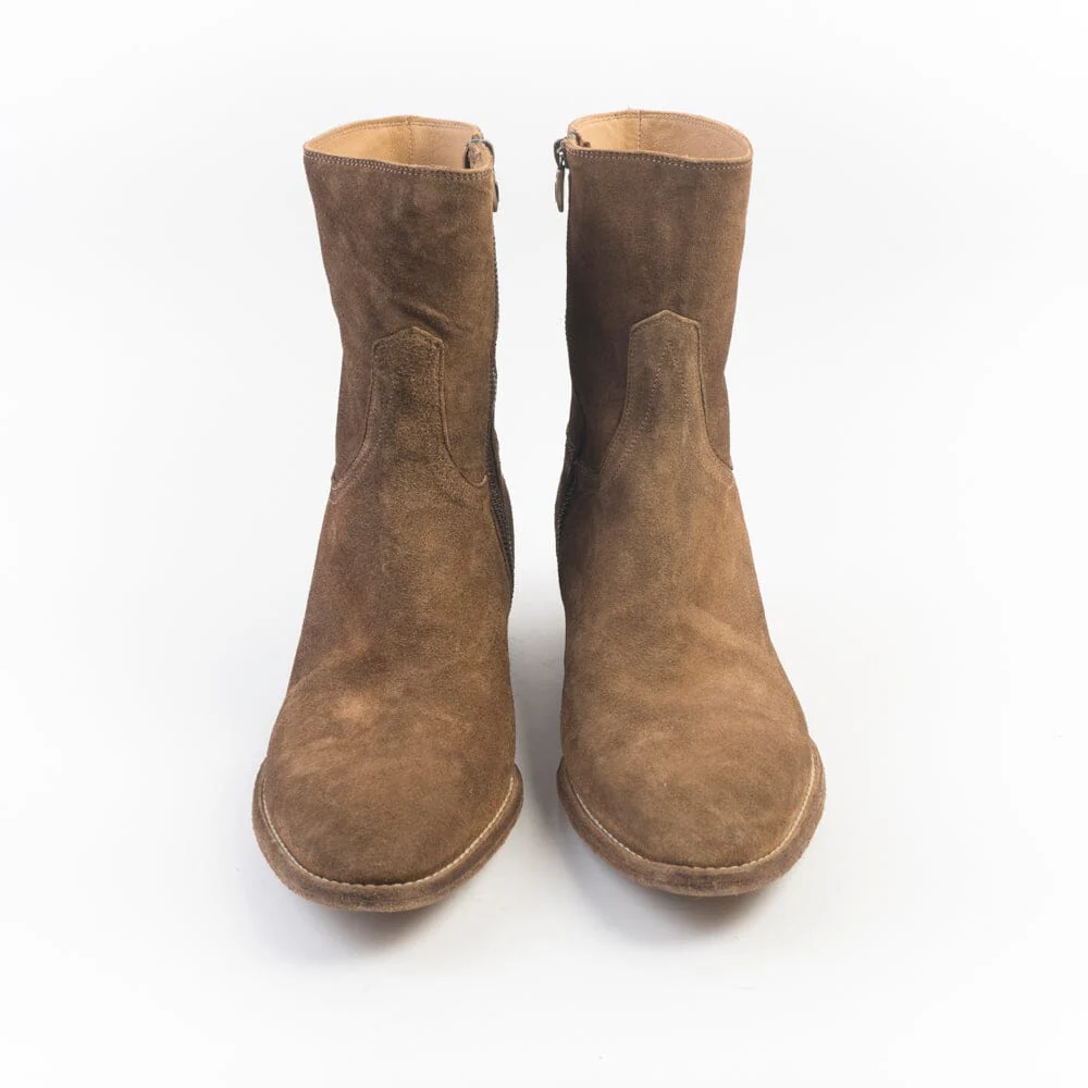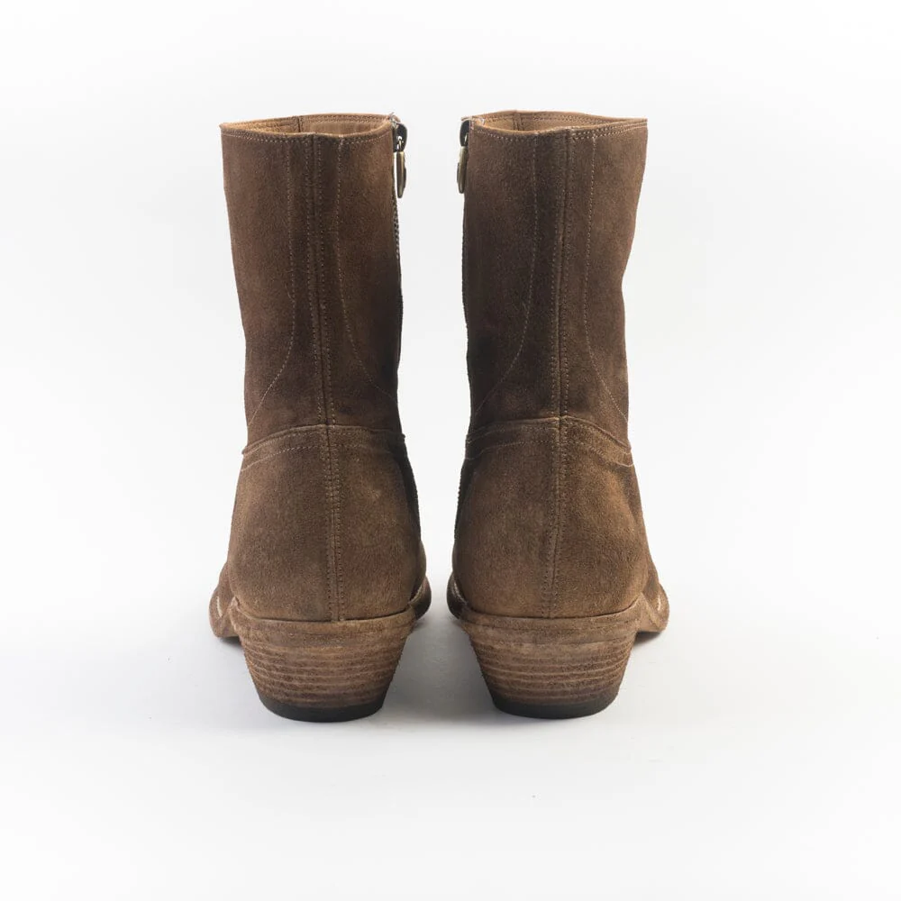 Stivale texano di Fauzian Jeunesse realizzato in camoscio ad effetto anticato di colore cuoio con punta affusolata. Chiusura con zip nella parte interna dello stivaletto. Interno e sottopiede rivestito in pelle. Suola in cuoio effetto vintage. Tacco di altezza 4 cm.