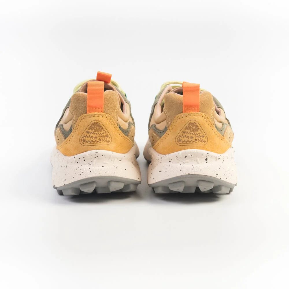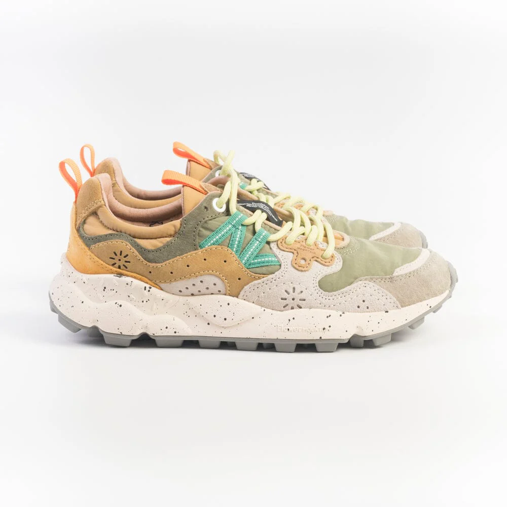 Originali sneakers Yamano3 di Flower Mountain, realizzate in tessuto tecnico di colore verde kaki e camoscio di colore taupe, grigio e verde con dettagli in nabuck di colore mostarda sul retro. Dettagli fascette di colore verde. Lacci di colore giallo lime. Soletta interna in sughero amovibile. Maxi suola antiscivolo per un totale comfort della calzata di colore avorio.