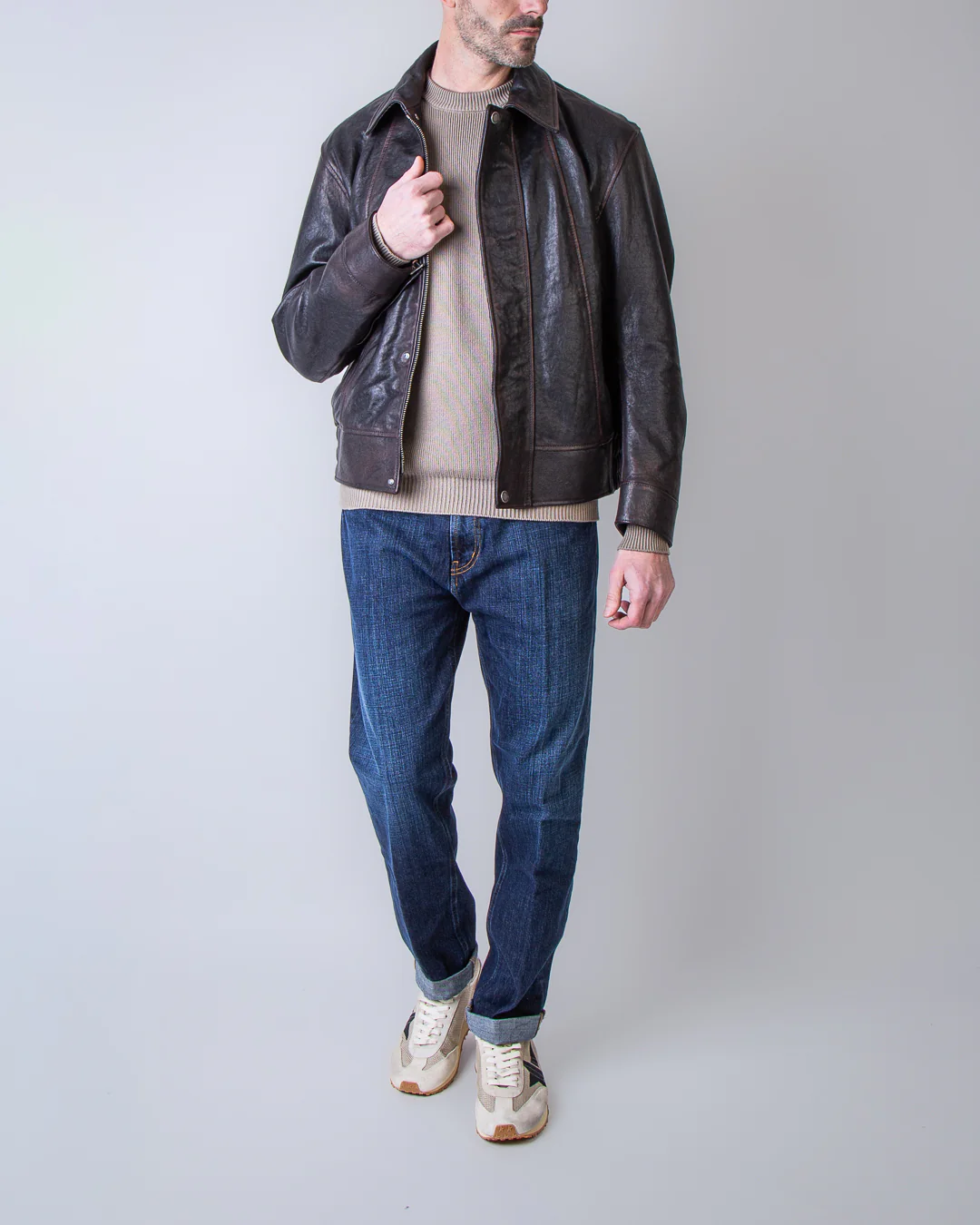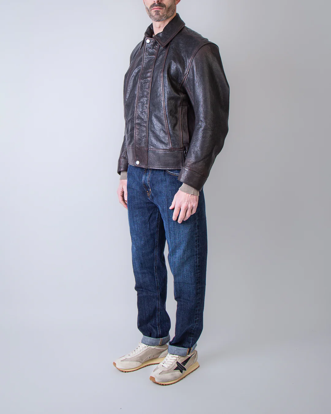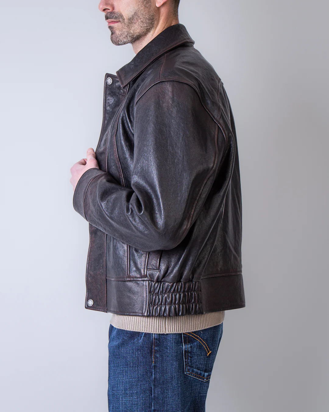 Golden Goose, giubbotto pelle uomo GMP02531.P002301 40249 marrone, bomber, con zip e bottoni, elastico sui fianchi. Il modello รจ alto 186cm e indossa una taglia 48