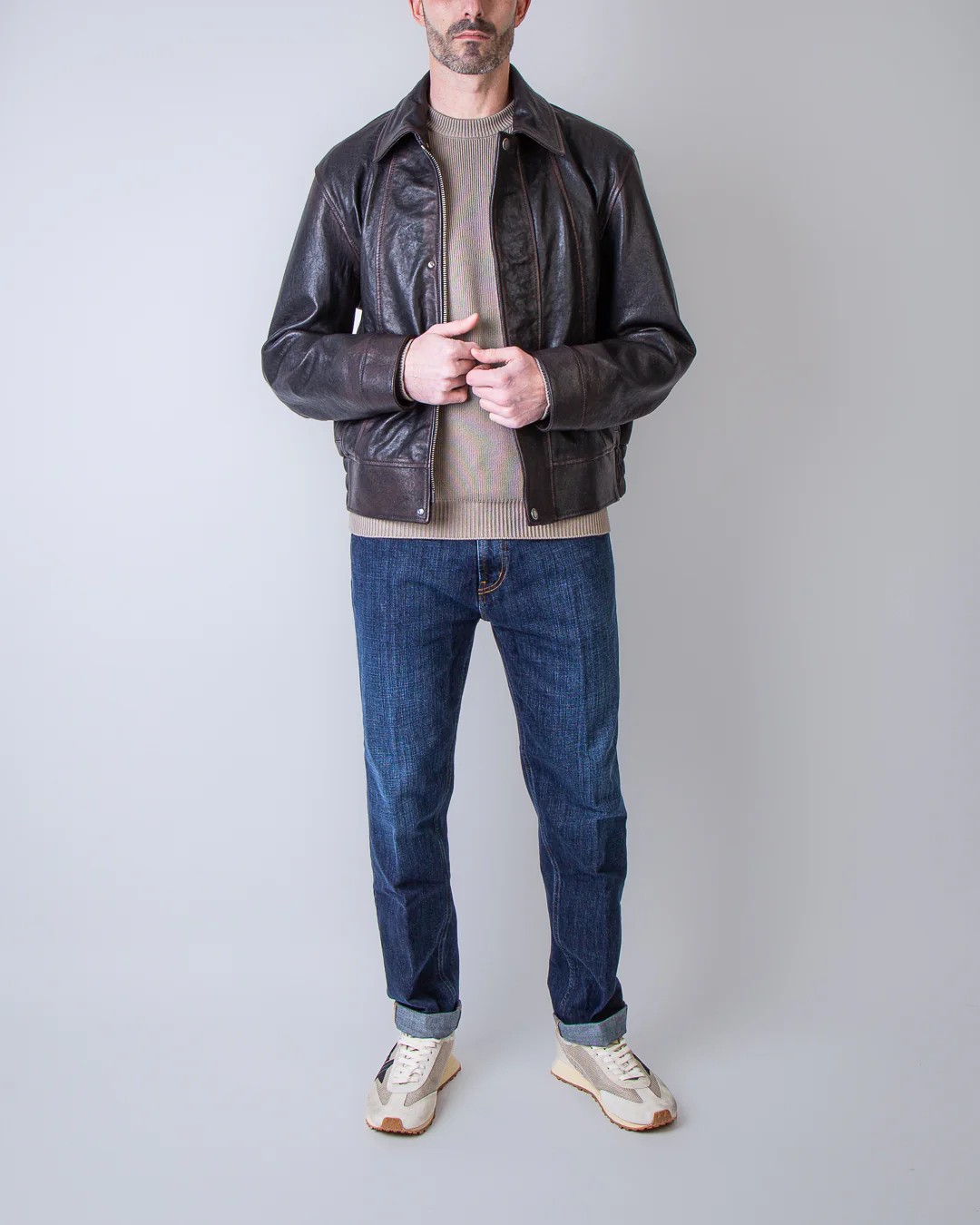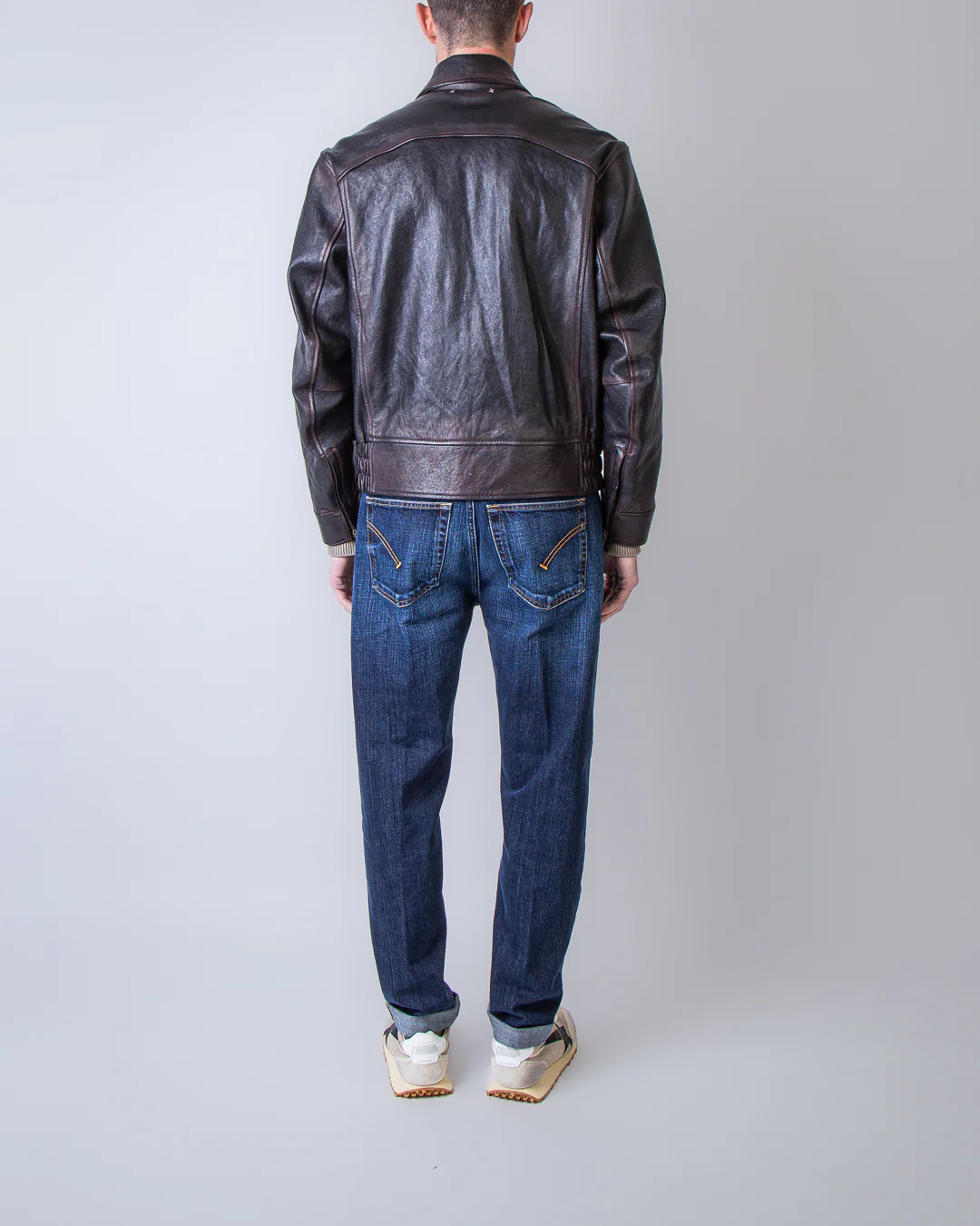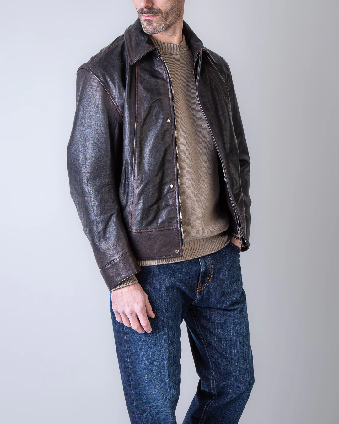 Golden Goose, giubbotto pelle uomo GMP02531.P002301 40249 marrone, bomber, con zip e bottoni, elastico sui fianchi. Il modello รจ alto 186cm e indossa una taglia 48