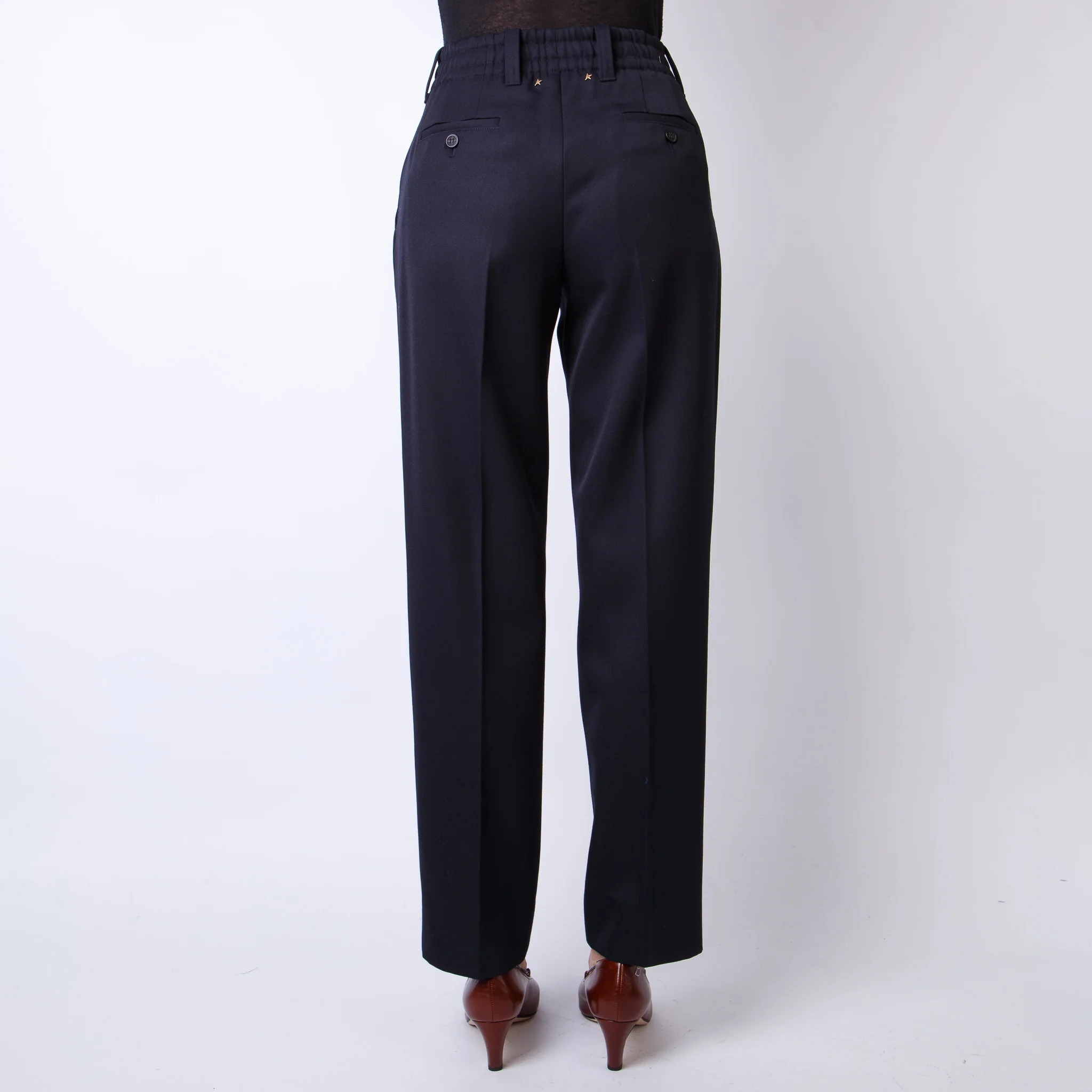 Golden Goose, pantaloni donna GWP01504.P00096150486 blu. Journey CollectionDoppia stellina sul retroQuattro tascheGamba affusolataElastico in vitaChiusura con bottoneMade in Italy Composizione: 43% lana, 43% viscosa, 14% poliammide La modella รจ alta175 cm e indossa la taglia 38
