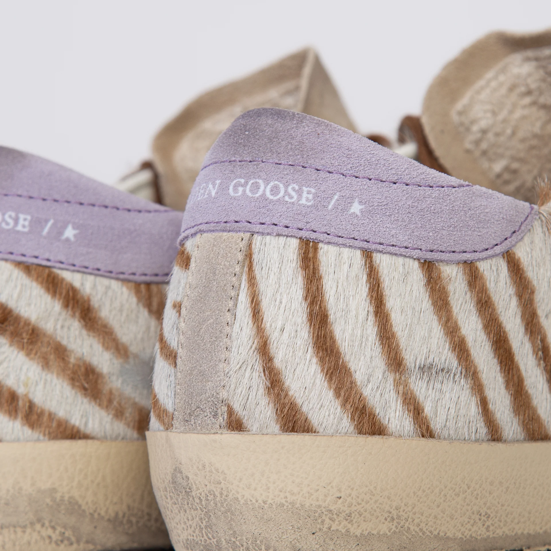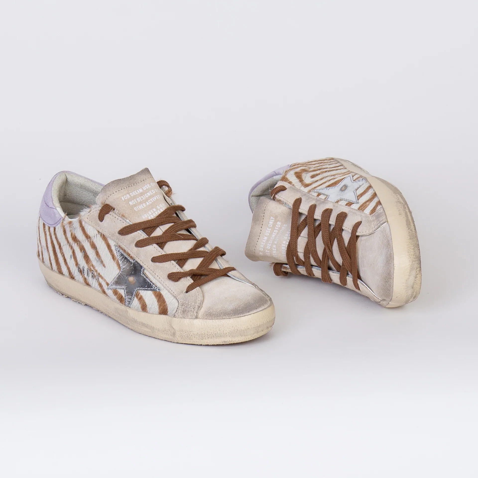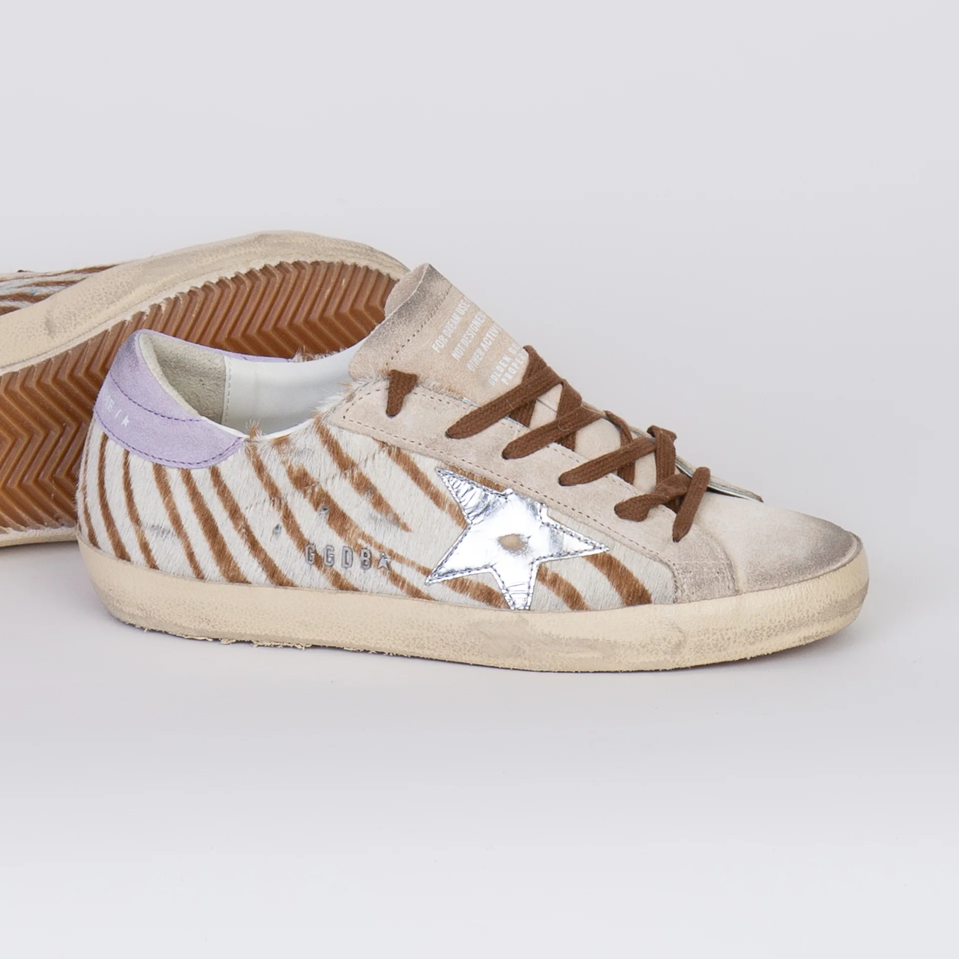 Golden Goose, sneakers donna GWF00101.F007507 82997 Modello superstar in fantasia zebrata bianca e marroneStella iconica laminata color argentoTalloncino in suede viola La scarpa scattata รจ una taglia 38