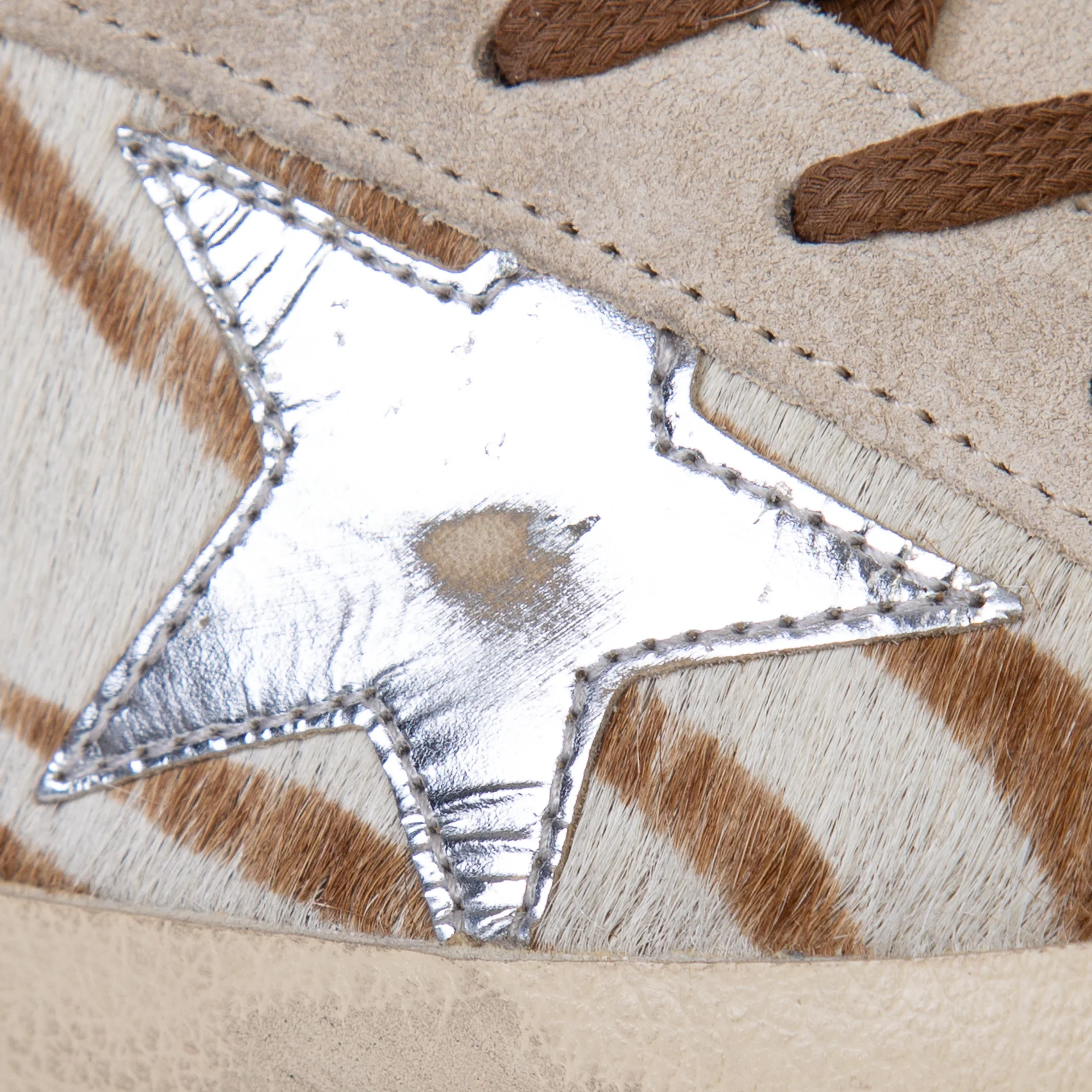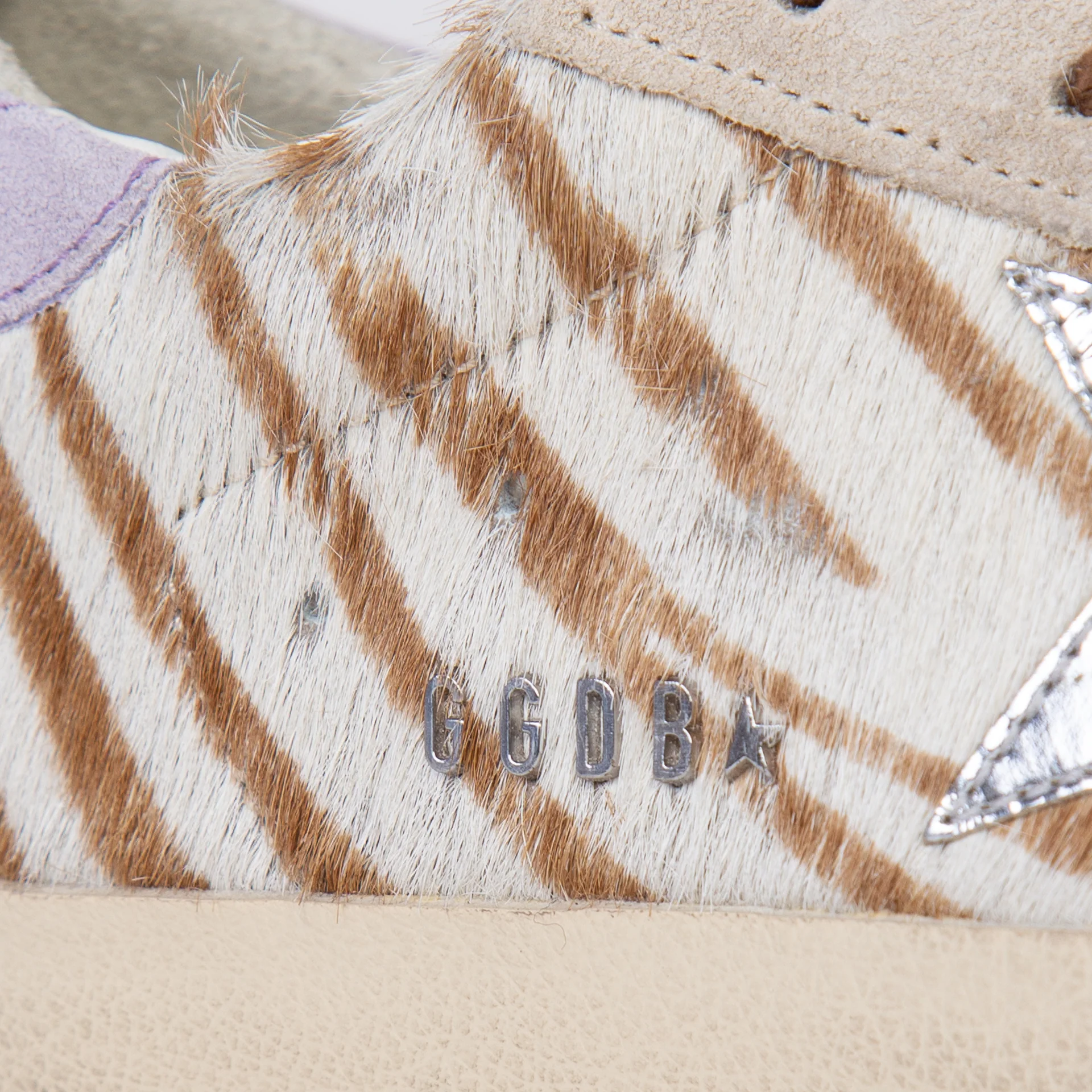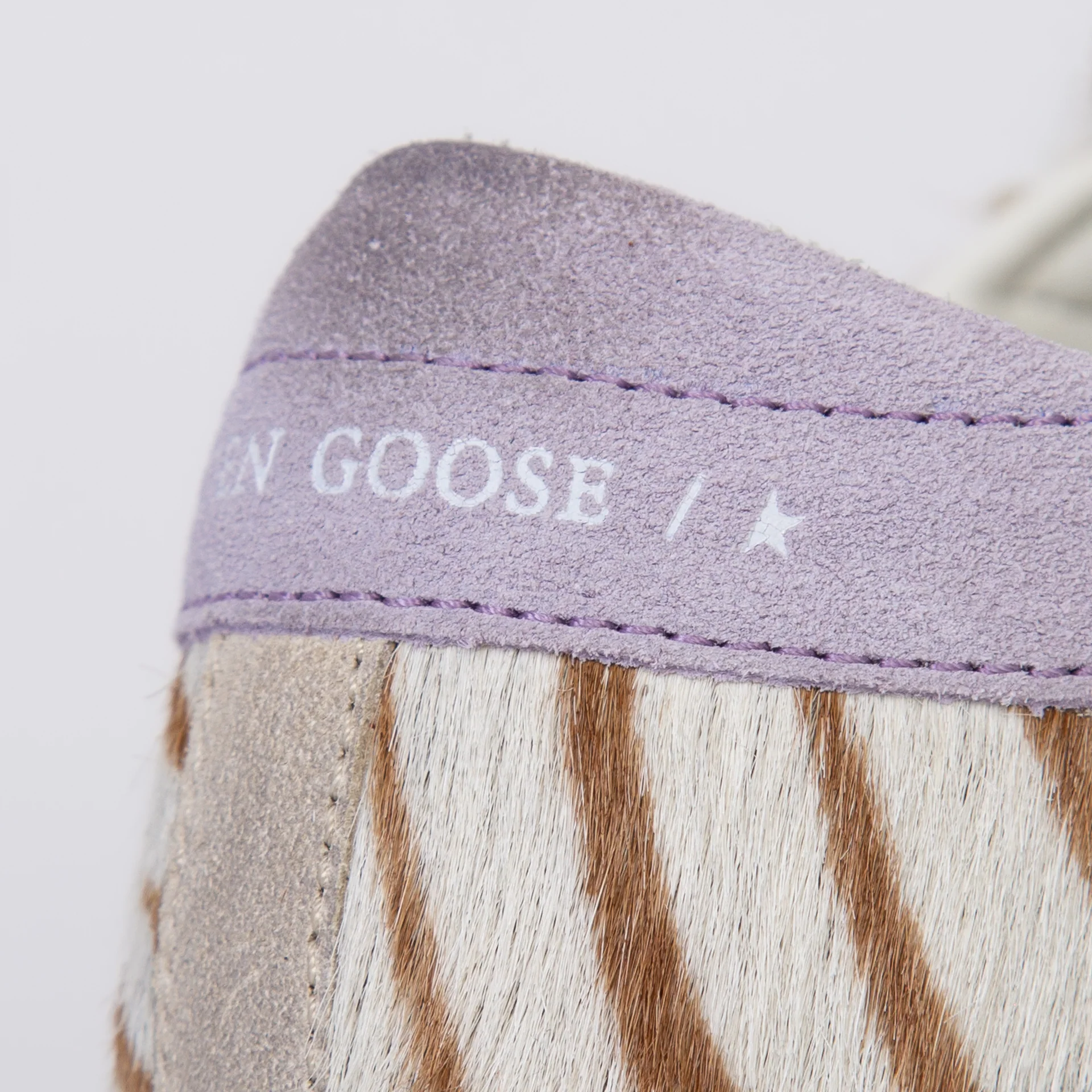 Golden Goose, sneakers donna GWF00101.F007507 82997 Modello superstar in fantasia zebrata bianca e marroneStella iconica laminata color argentoTalloncino in suede viola La scarpa scattata รจ una taglia 38