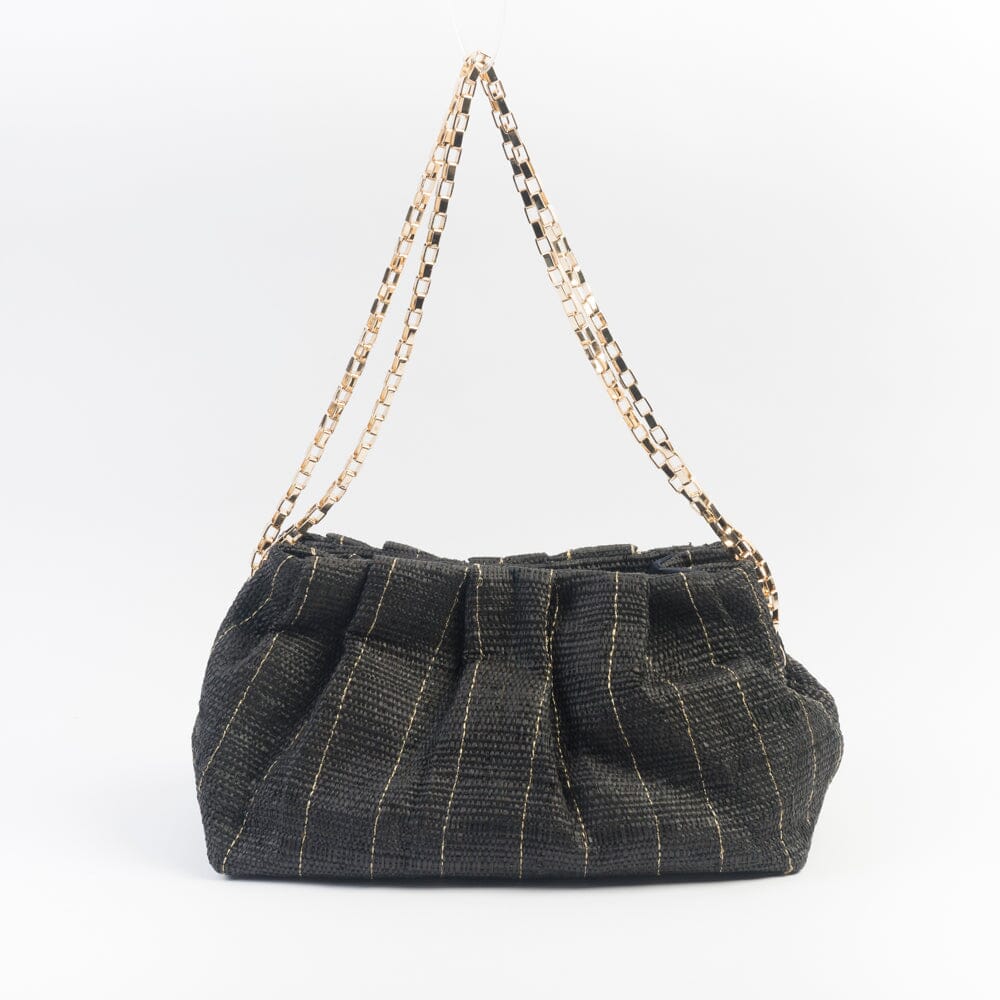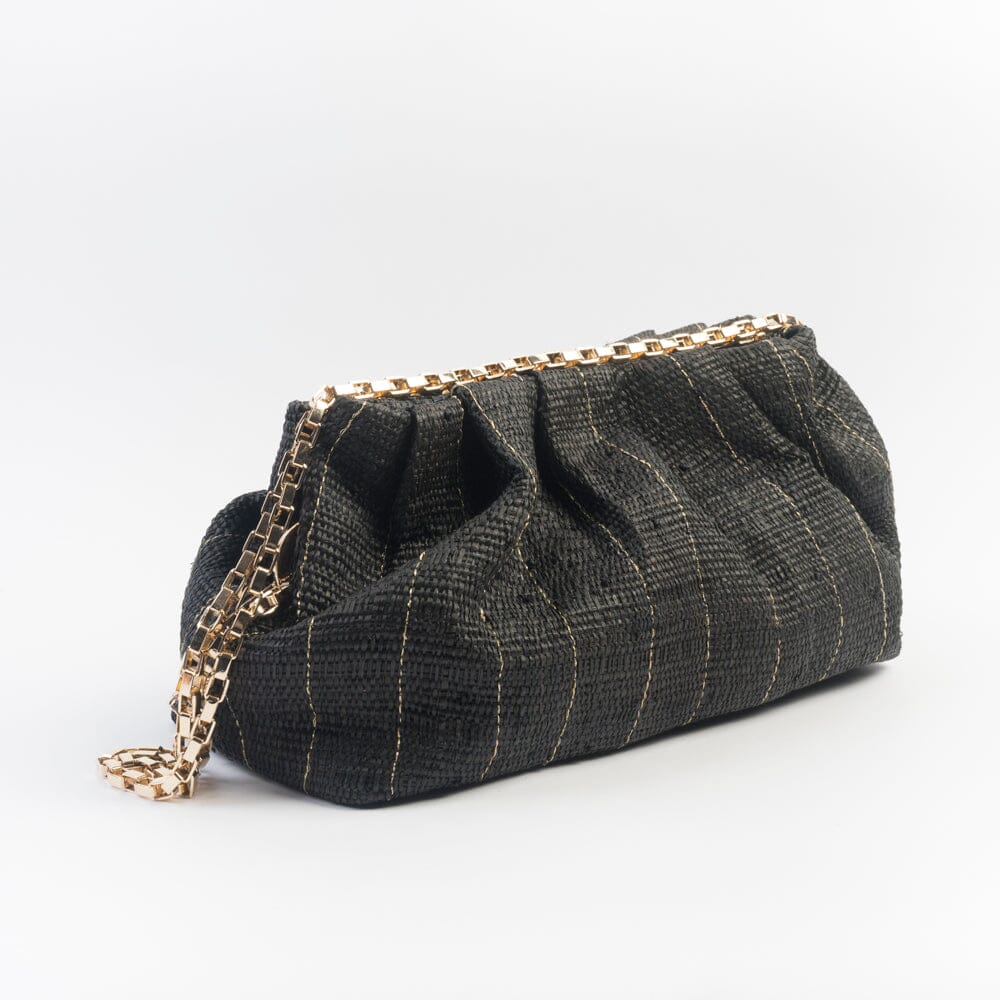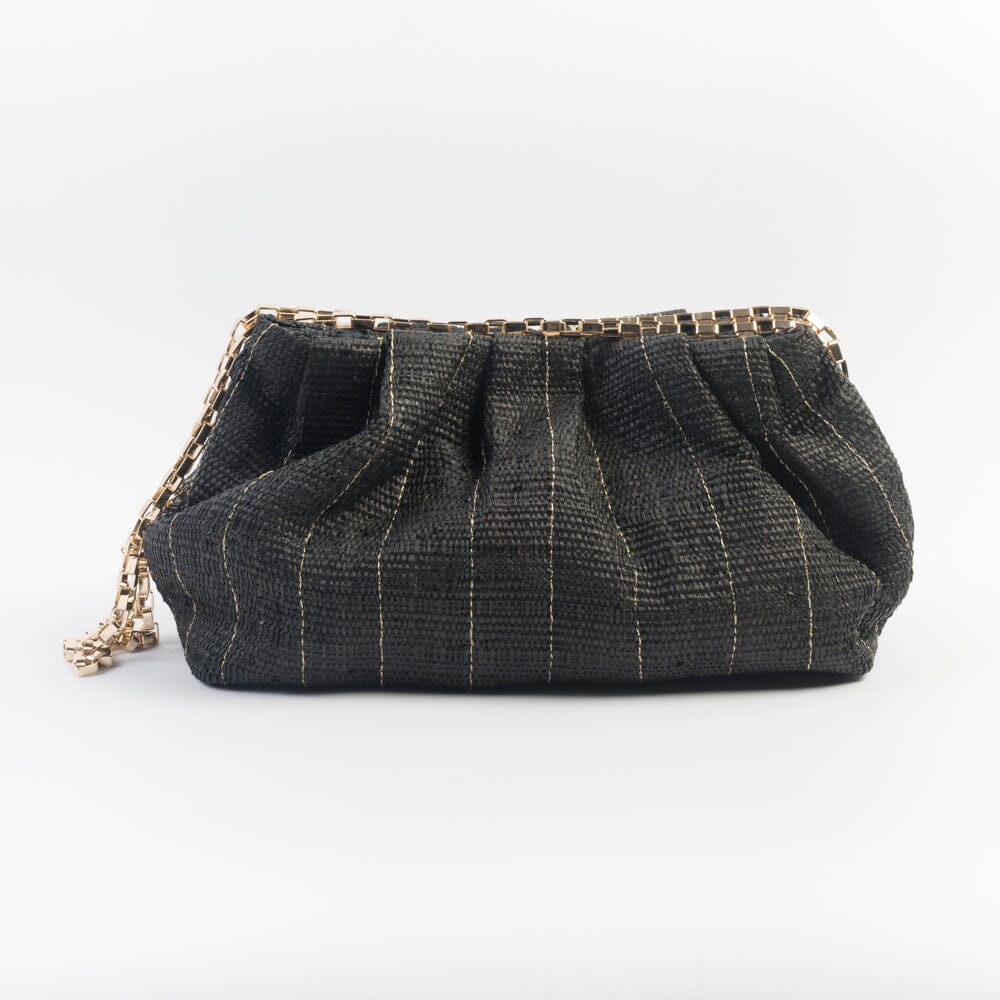 Pouch realizzata da Good People in raffia naturale di colore nero con filo laminato di colore dorato. Doppia tracolla a catenella di colore dorato da tenere a spalla o all’interno della borsa come clutch. Chiusura con bottoni automatici centrali e laterali.
