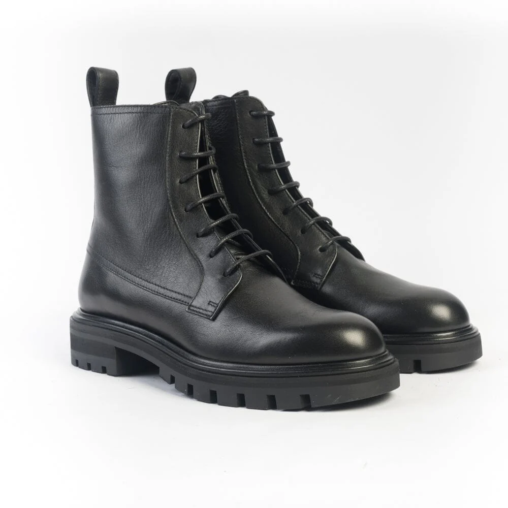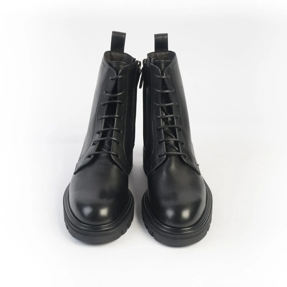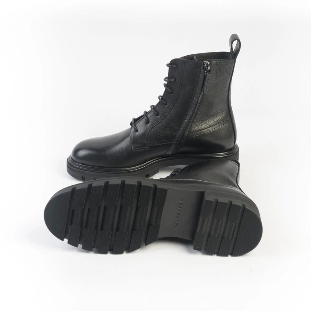 Stivaletto modello anfibio di Henderson, realizzato in morbida pelle di vitello di colore nero con fettuccia in pelle per facilitare la calzata. Lacci di cotone cerati di colore nero. Interno foderato in pelle. Zip nel lato interno per facilitare la calzata. Soletta interna in pelle estraibile. Suola in gomma antiscivolo di 2 centimentri, tacco 3 centimetri.