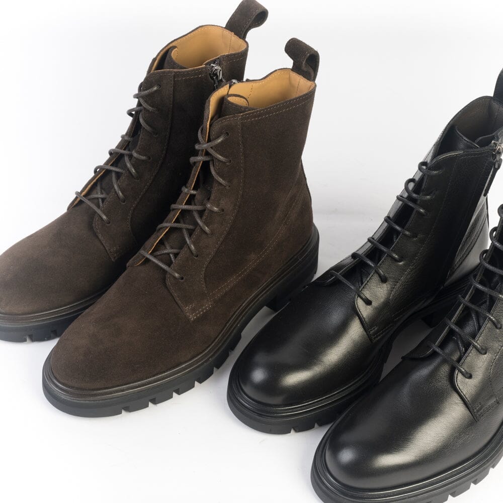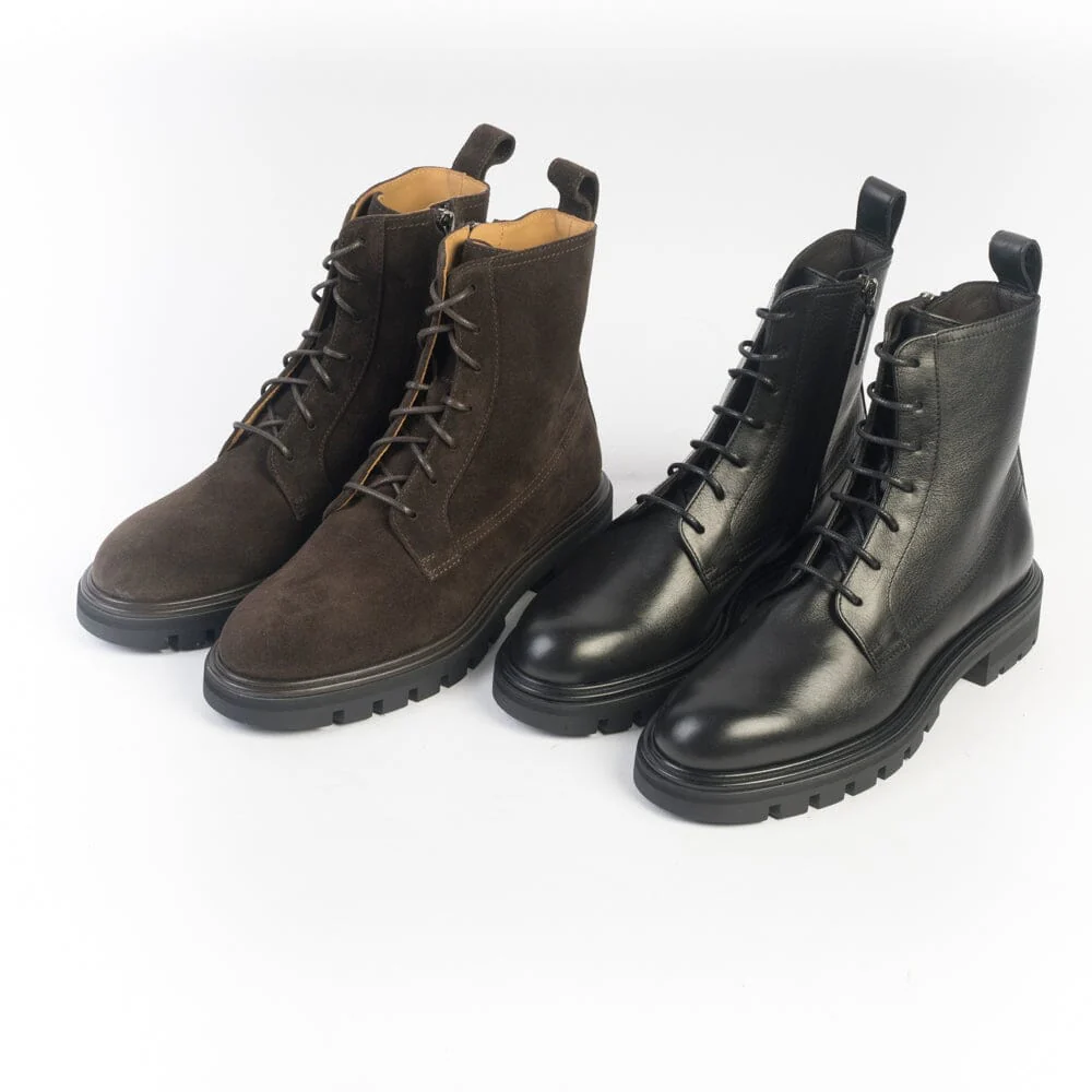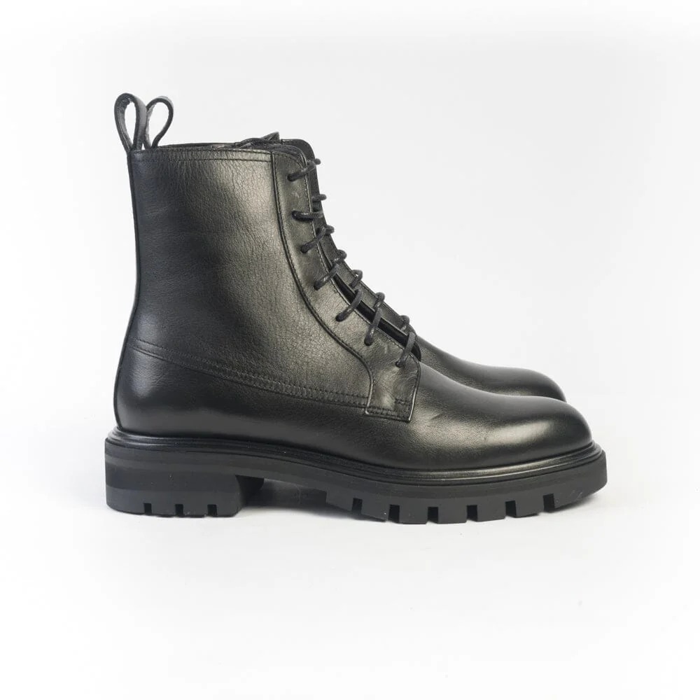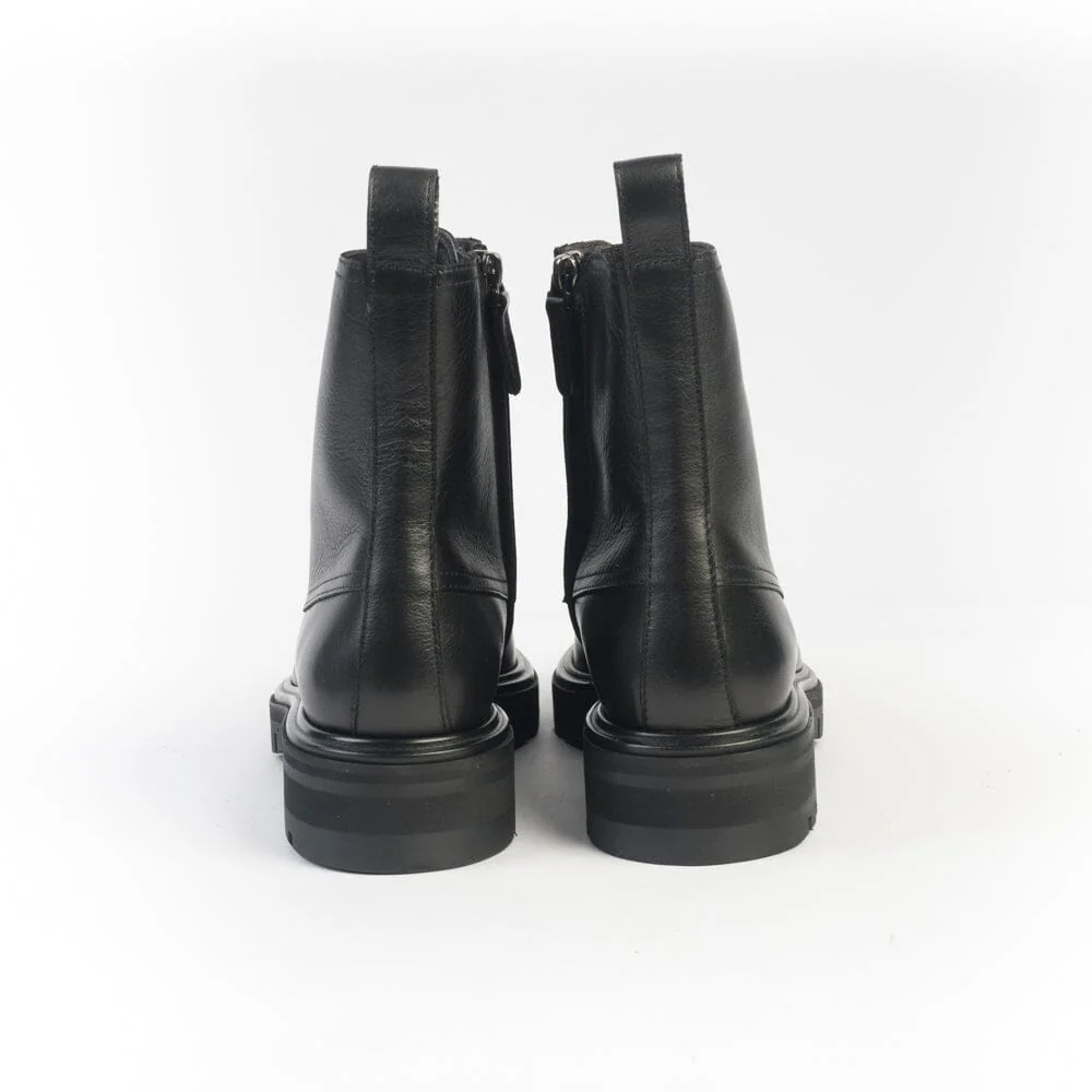 Stivaletto modello anfibio di Henderson, realizzato in morbida pelle di vitello di colore nero con fettuccia in pelle per facilitare la calzata. Lacci di cotone cerati di colore nero. Interno foderato in pelle. Zip nel lato interno per facilitare la calzata. Soletta interna in pelle estraibile. Suola in gomma antiscivolo di 2 centimentri, tacco 3 centimetri.