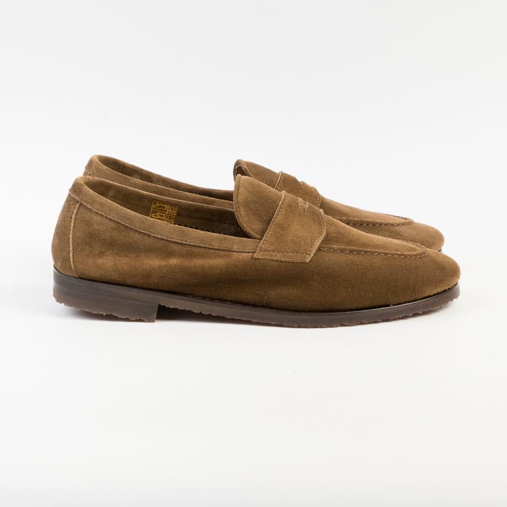 Mocassino con mascherina di Henderson, realizzato in morbidissimo camoscio di colore bruciato. Lavorazione a sacchetto, interno sfoderato. Suola in vera gomma naturale.