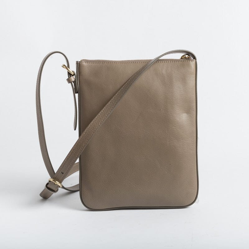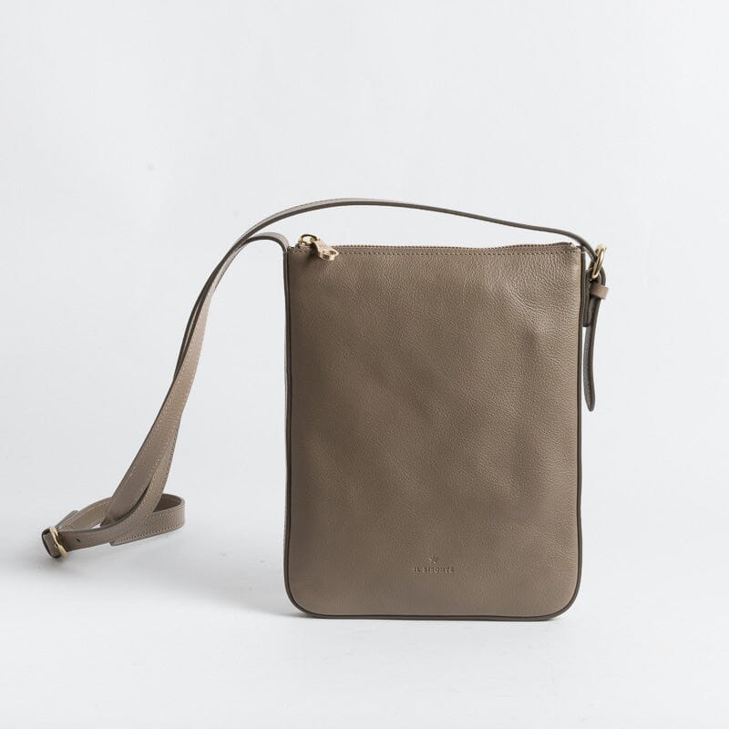 Borsello de Il Bisonte, realizzato in pelle di colore tortora. Chiusura centrale con zip. Tracolla regolabile in pelle di colore nero. Interno foderato in tessuto con taschine. Dettagli in nikel dorato.