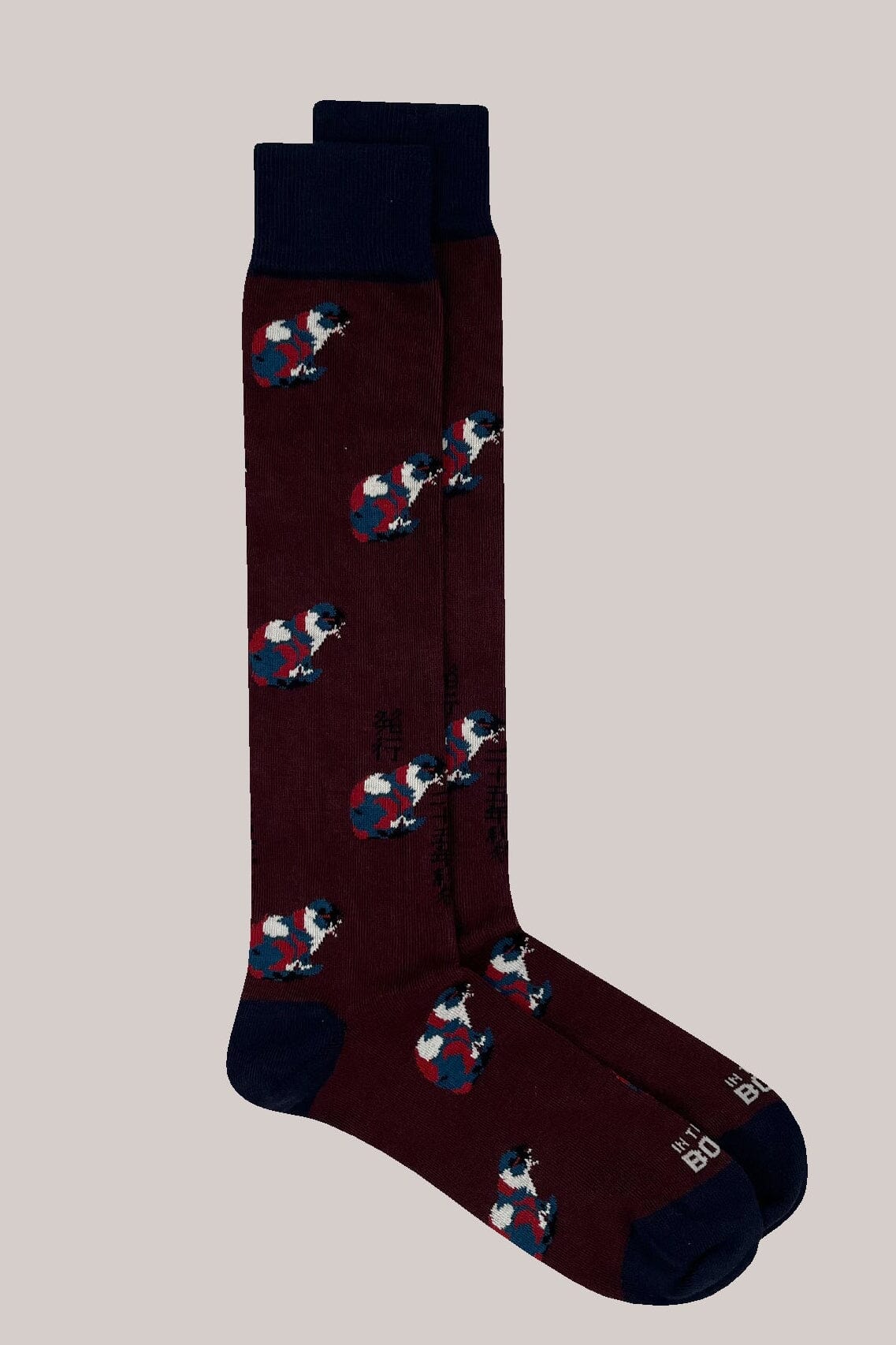 Calzino lungo di colore bordeaux con disegno a tema Gatti di colore mattone, bluette e bianco. Bordino gambale di colore blu.